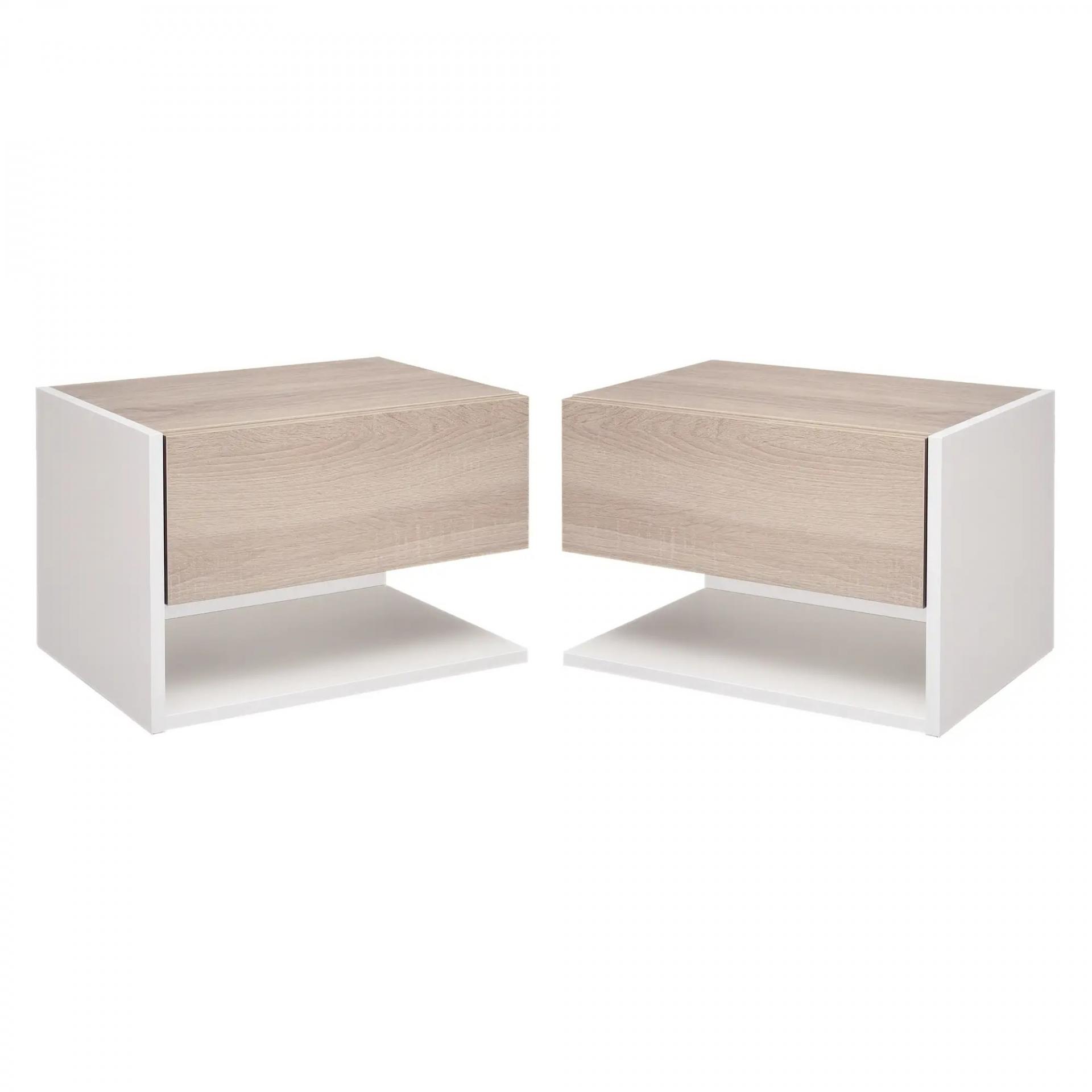 Juego de 2 Mesitas de Noche Flotantes Mesitas de Noche Colgantes con 1 Cajón y Estante Abierto 46x30x30cm Roble y Blanco