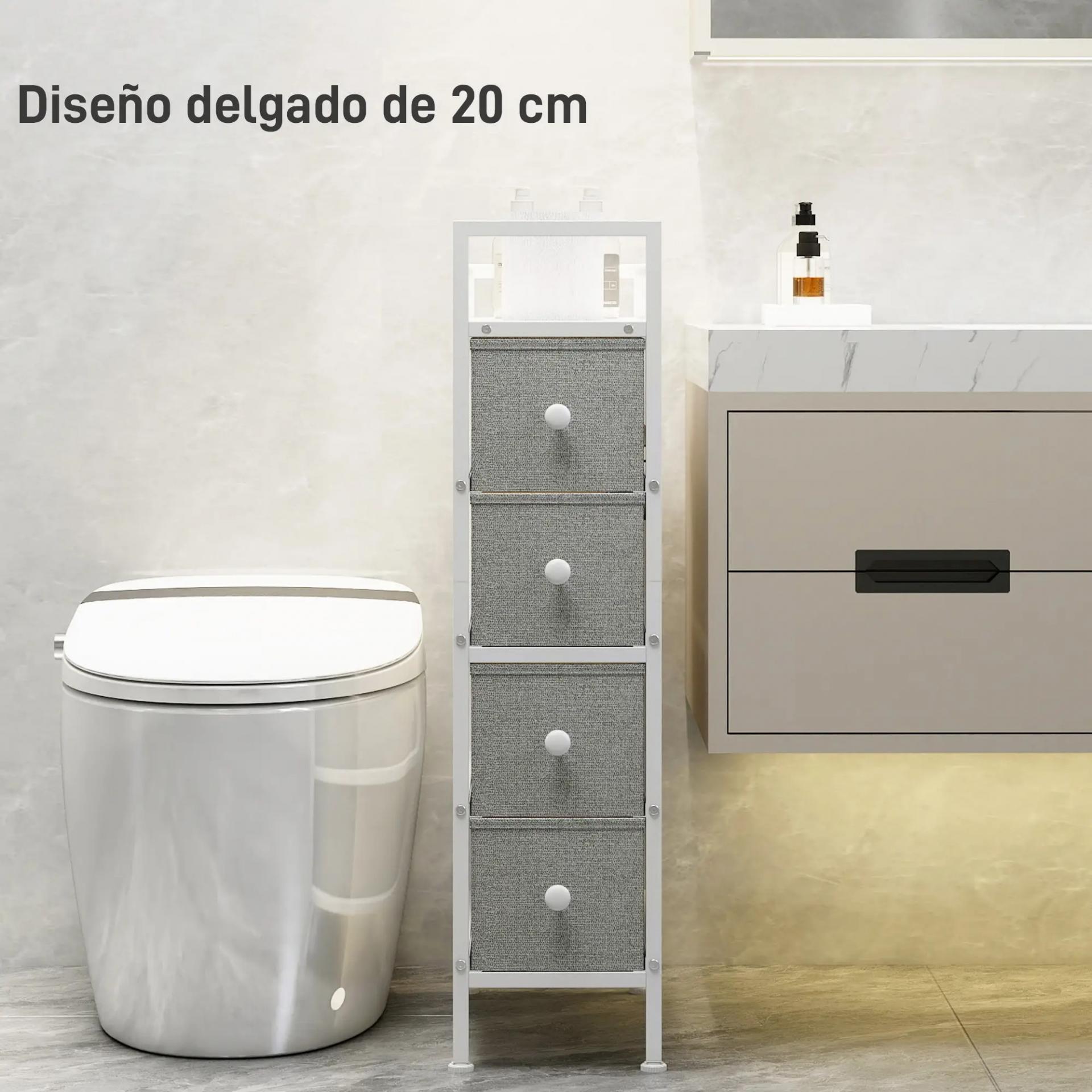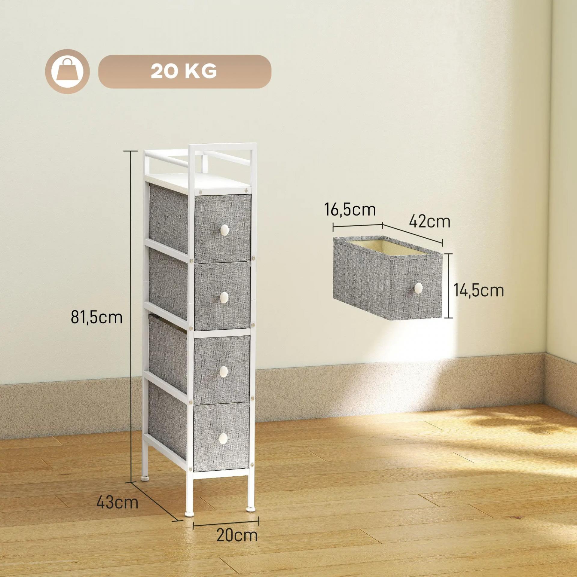 - ALMACENAJE VERTICAL CON CUATRO CAJONES: La cajonera de tela gris y estructura blanca incluye cuatro cajones amplios para guardar ropa, accesorios o pequeños objetos. Su tablero superior con bordes elevados protege los artículos decorativos o el móvil