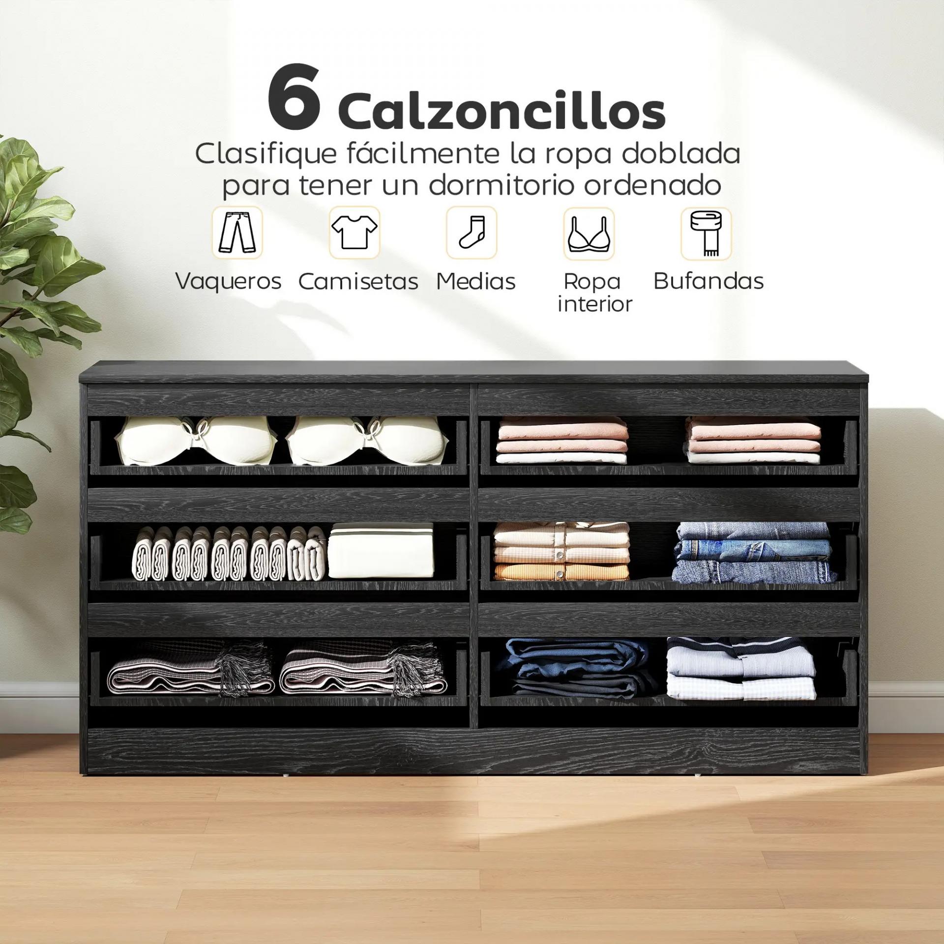 - 6 CAJONES: Esta cómoda ofrece un amplio espacio para organizar ropa, accesorios y objetos del día a día de forma práctica. Los bordes biselados en la parte superior de cada cajón facilitan la apertura y el cierre sin necesidad de tiradores ni esfuerzo