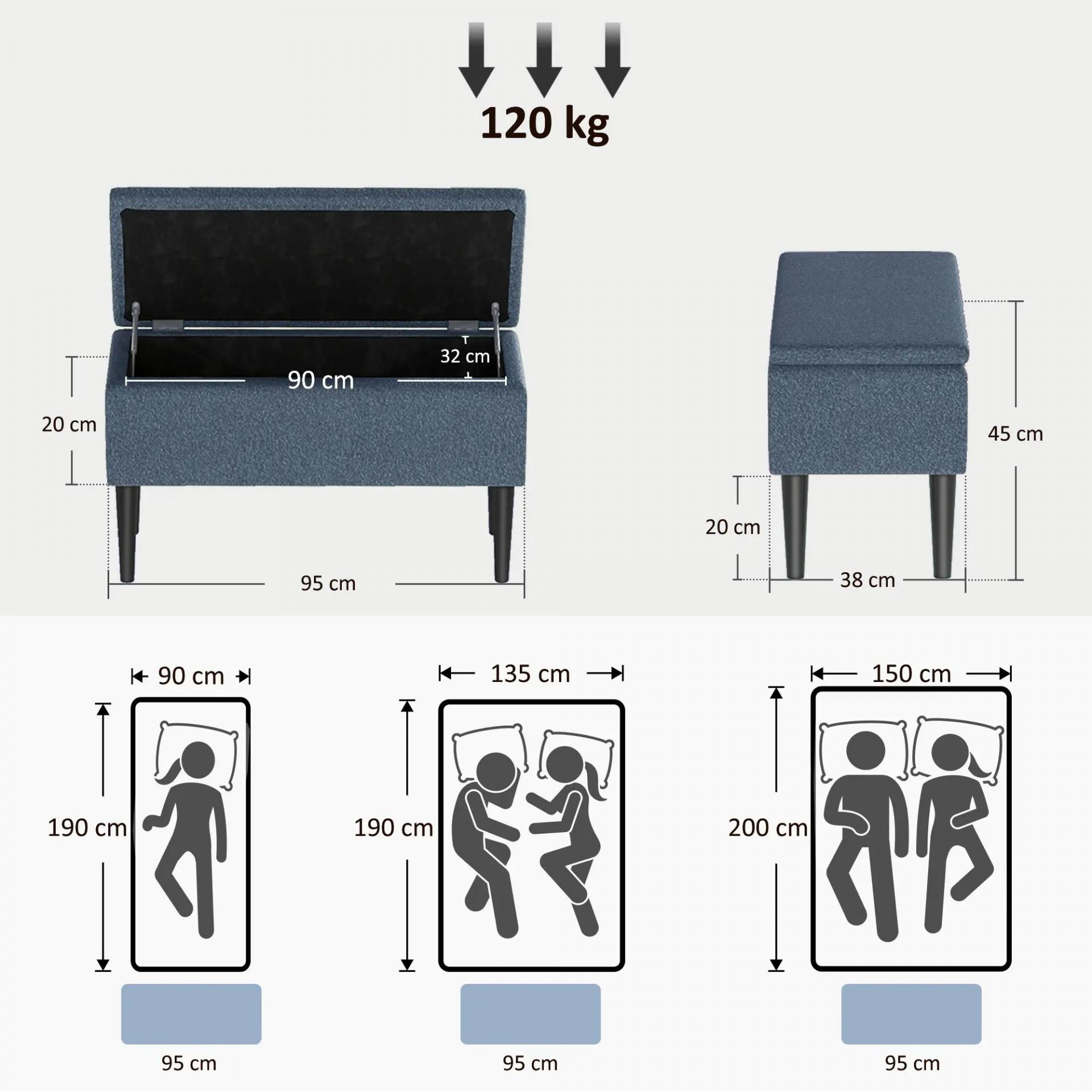 - MEDIDAS TOTALES: 95x38x45 cm (LxANxAL). Medidas del espacio de almacenamiento: 90x32x20 cm (LxANxAL). Peso máximo soportado: 120 kg. Este baúl de almacenaje para dormitorio requiere montaje