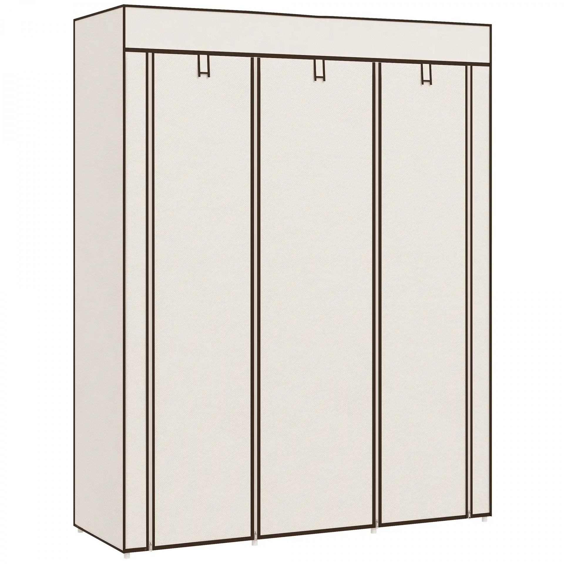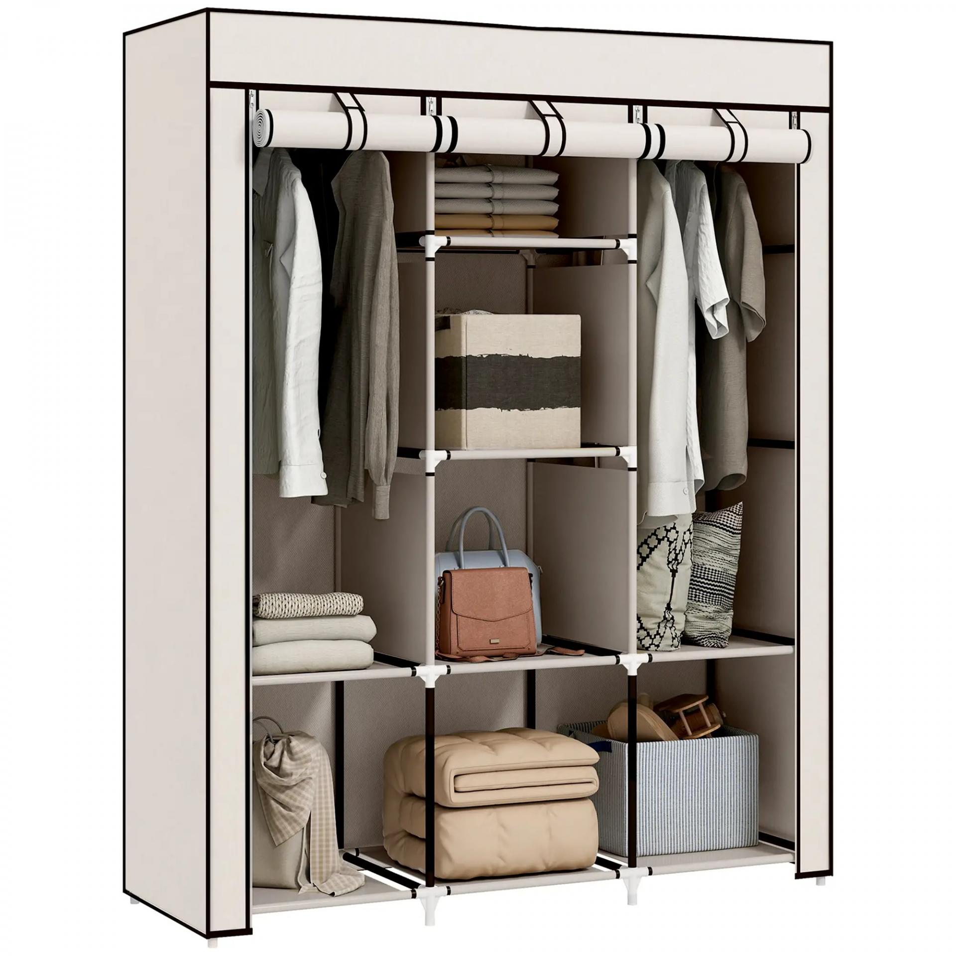 Armario de Tela Plegable Ropero Portátil con 8 Estantes y 2 Barras de Colgar para Dormitorio 125x43x162,5 cm Crema