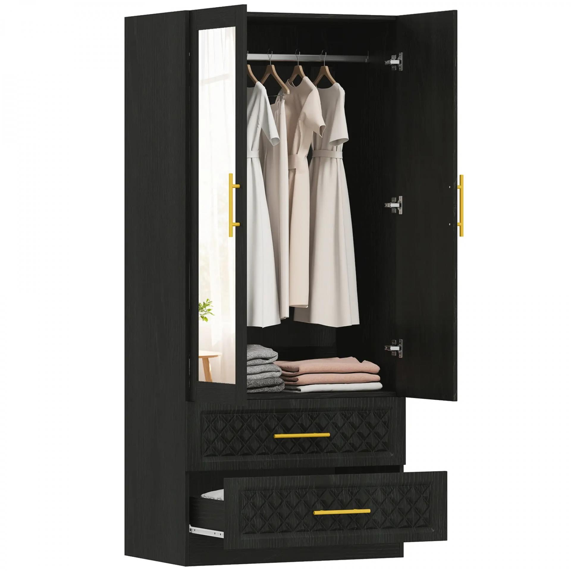 Armario Ropero con Espejo 2 Puertas y 2 Cajones Relieve de Diamante Barra para Colgar 80x50x180 cm Negro
