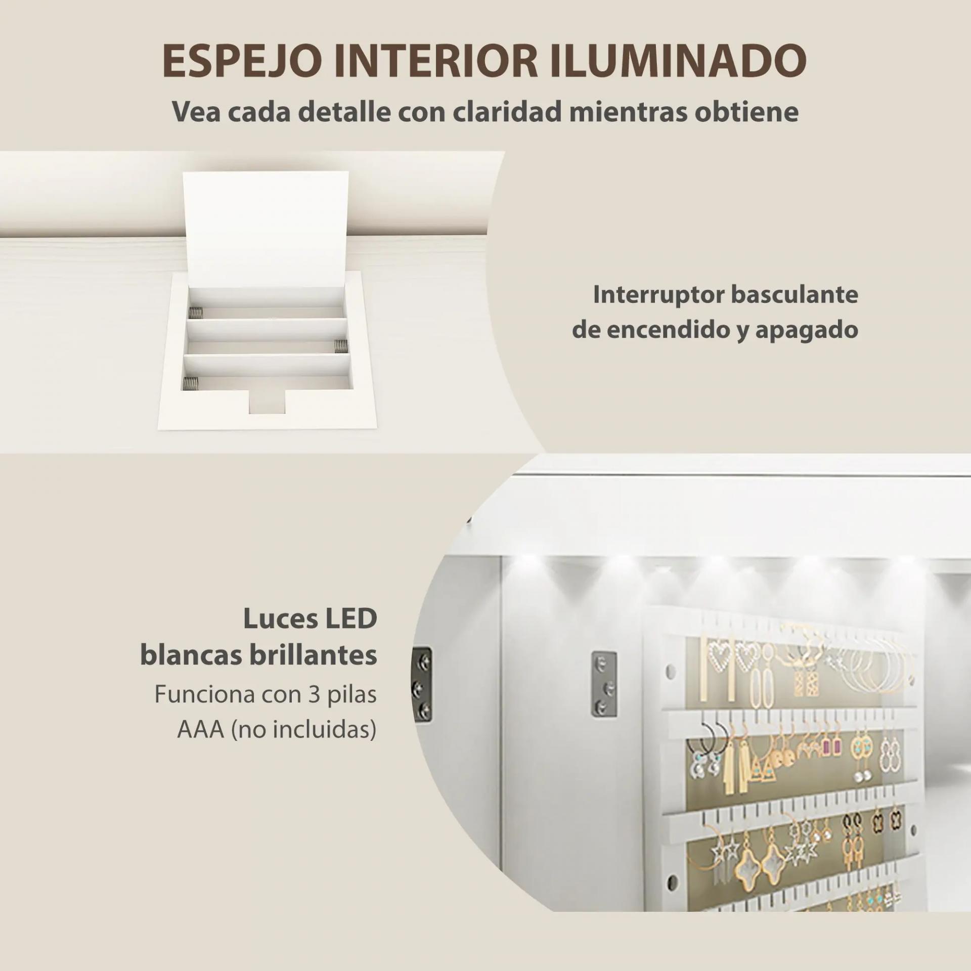 - ESPEJO INTERIOR CON ILUMINACIÓN INTEGRADA: Este armario joyero con espejo interior con luz te facilita el maquillaje y los retoques diarios. Funciona con una caja de baterías situada en la parte superior (3 pilas AAA, no incluidas)