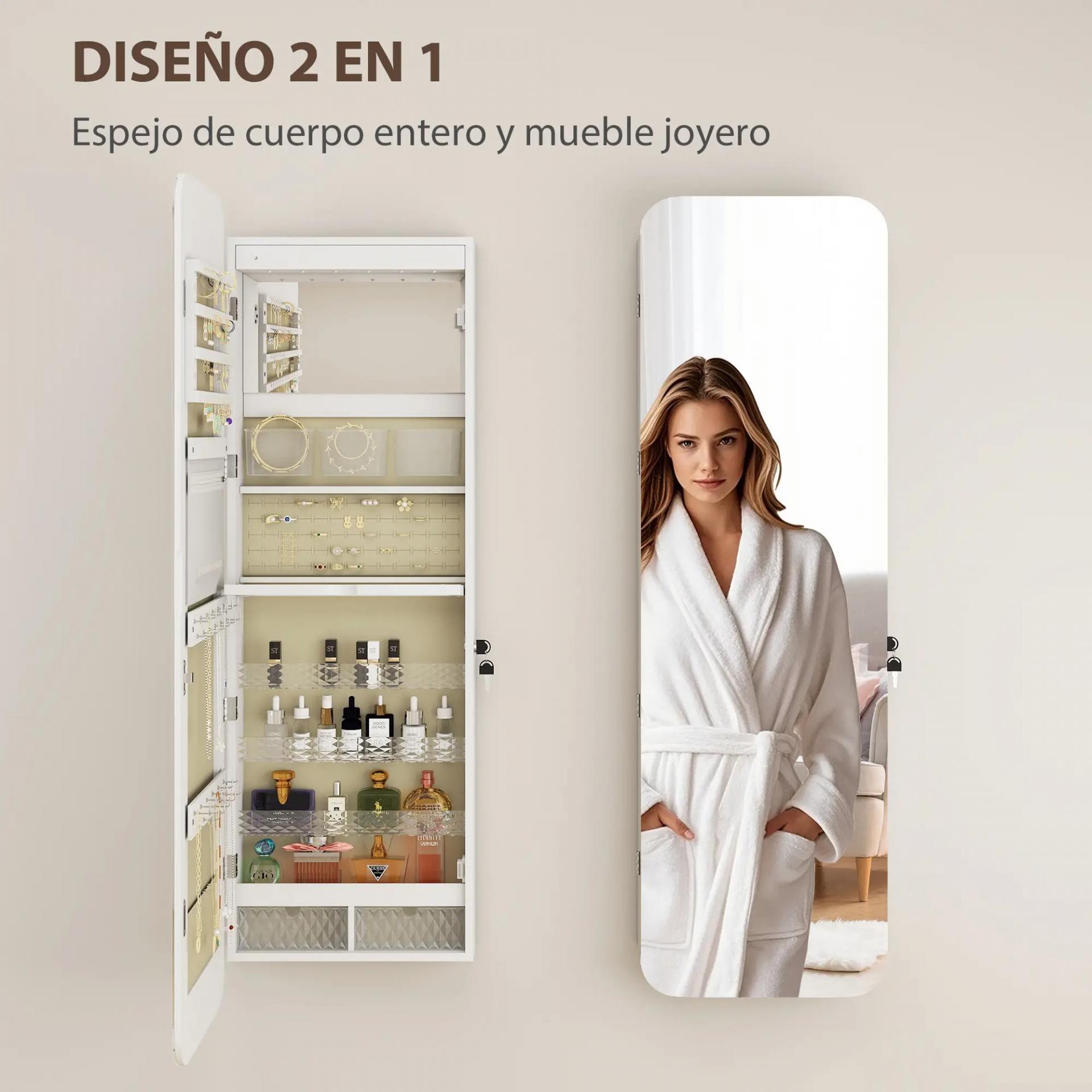 - ESPEJO DE CUERPO ENTERO PARA VERTE DE UN VISTAZO: Este armario joyero con espejo incluye un espejo frontal de 37x120 cm que te permite comprobar tu outfit completo junto con los accesorios, sin necesidad de desplazarte entre distintos espejos