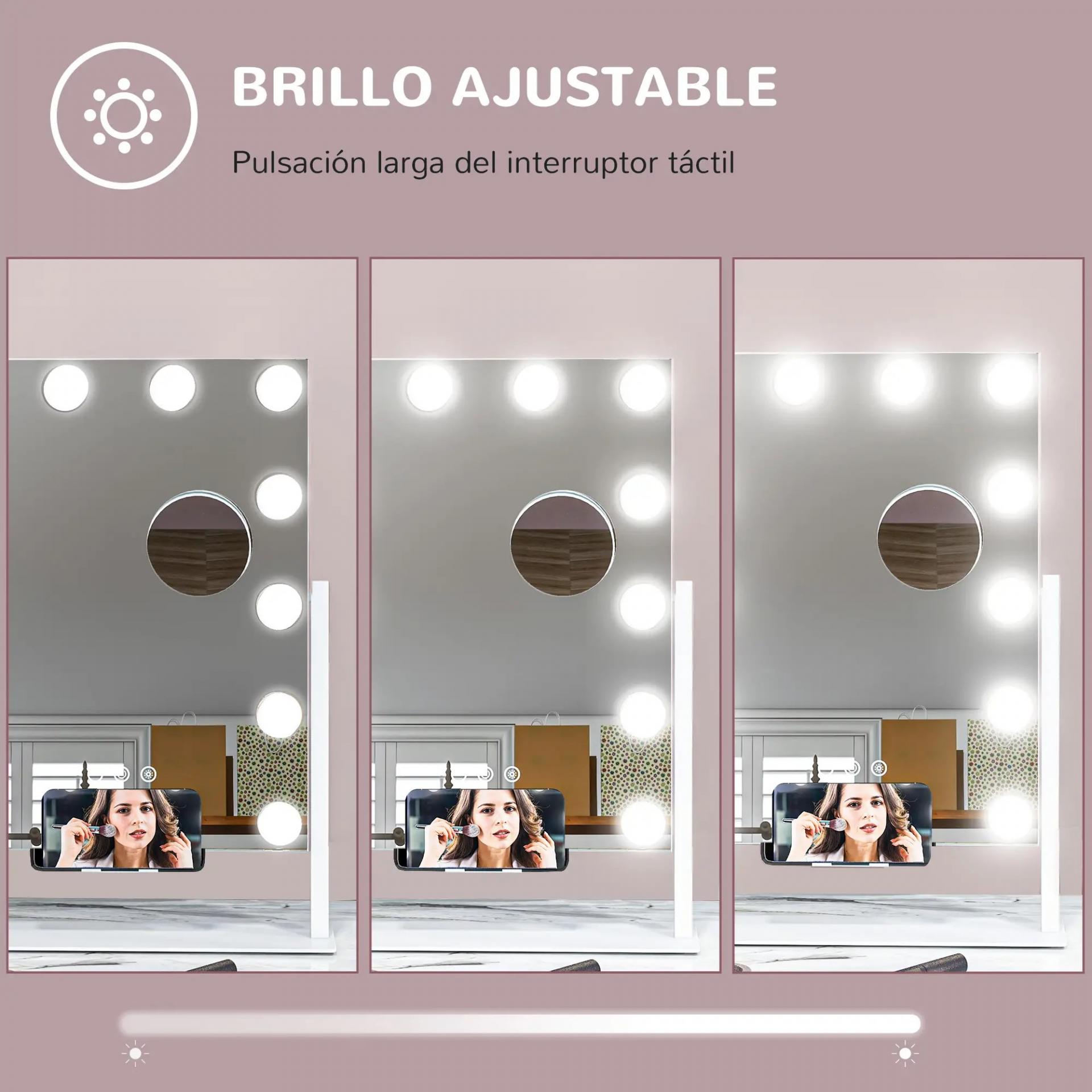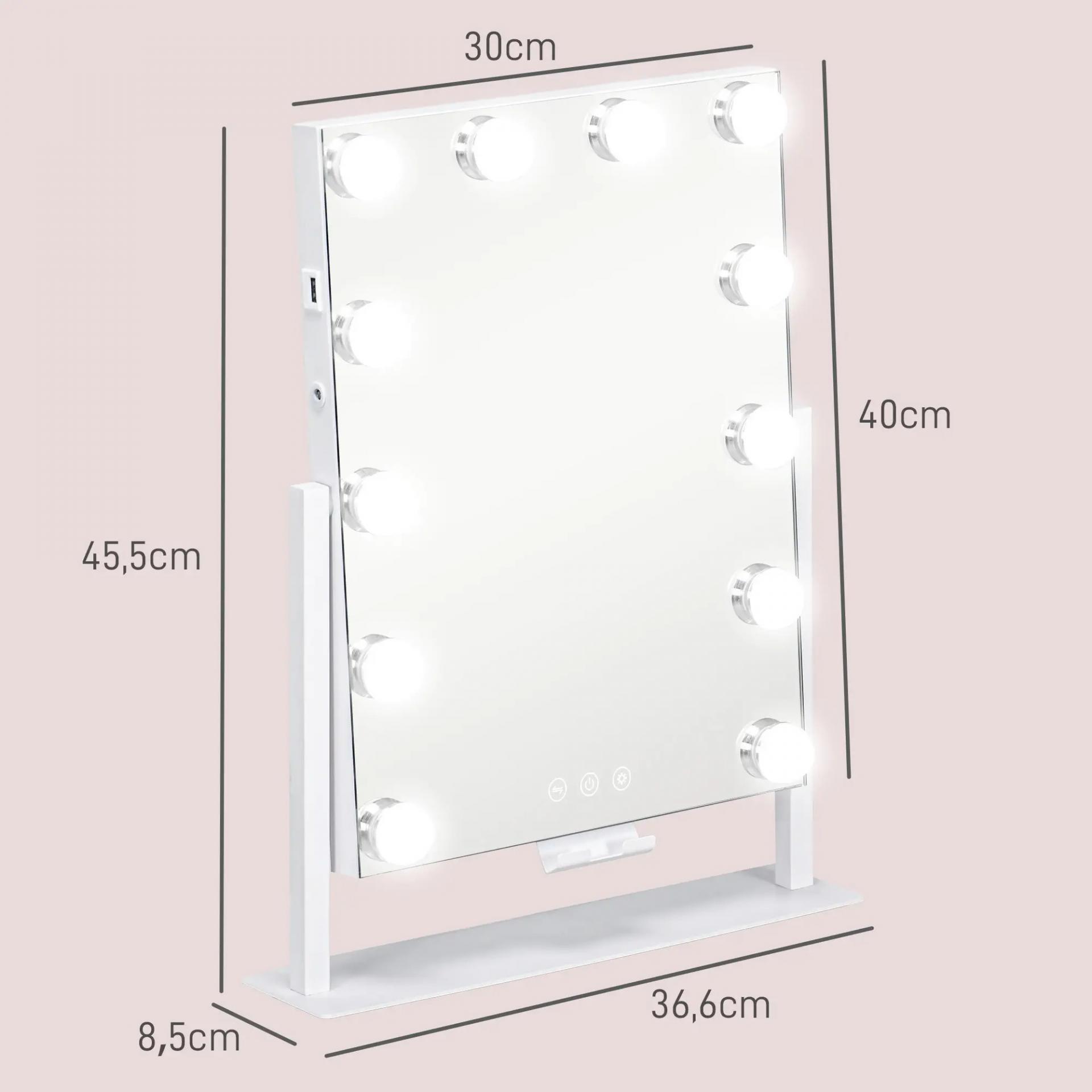 Espejo de Maquillaje con Luz 30x40 cm con 12 Bombillas 3 Modos de Iluminación Ajustables Interruptor Táctil Blanco