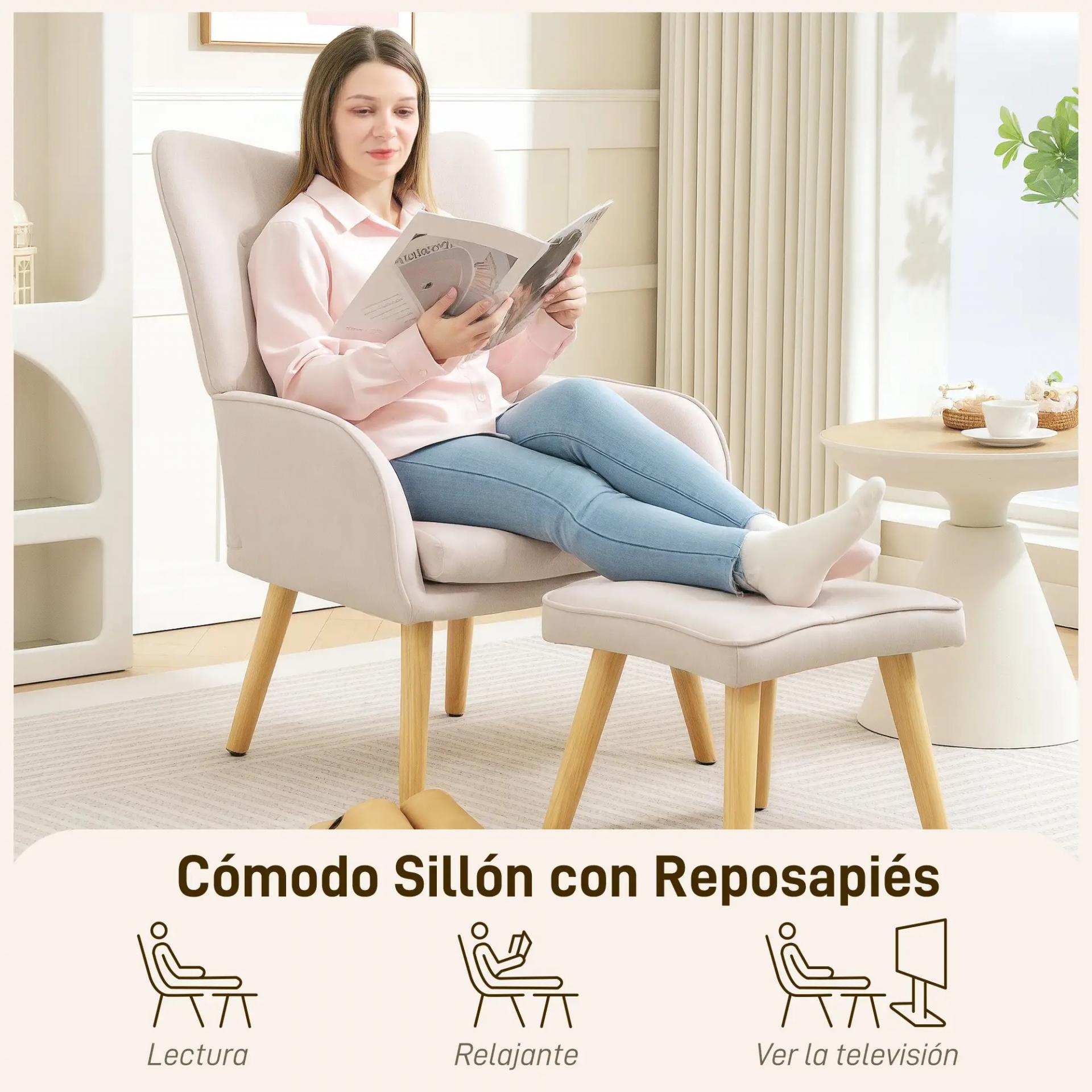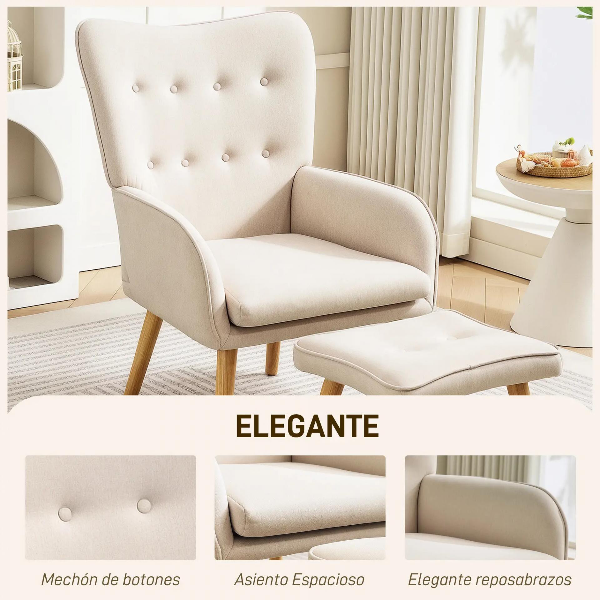 Sillón con Reposapiés Sillón Lectura con Respaldo Alto Capitoné Patas de Madera y Tapizado en Lino Beige