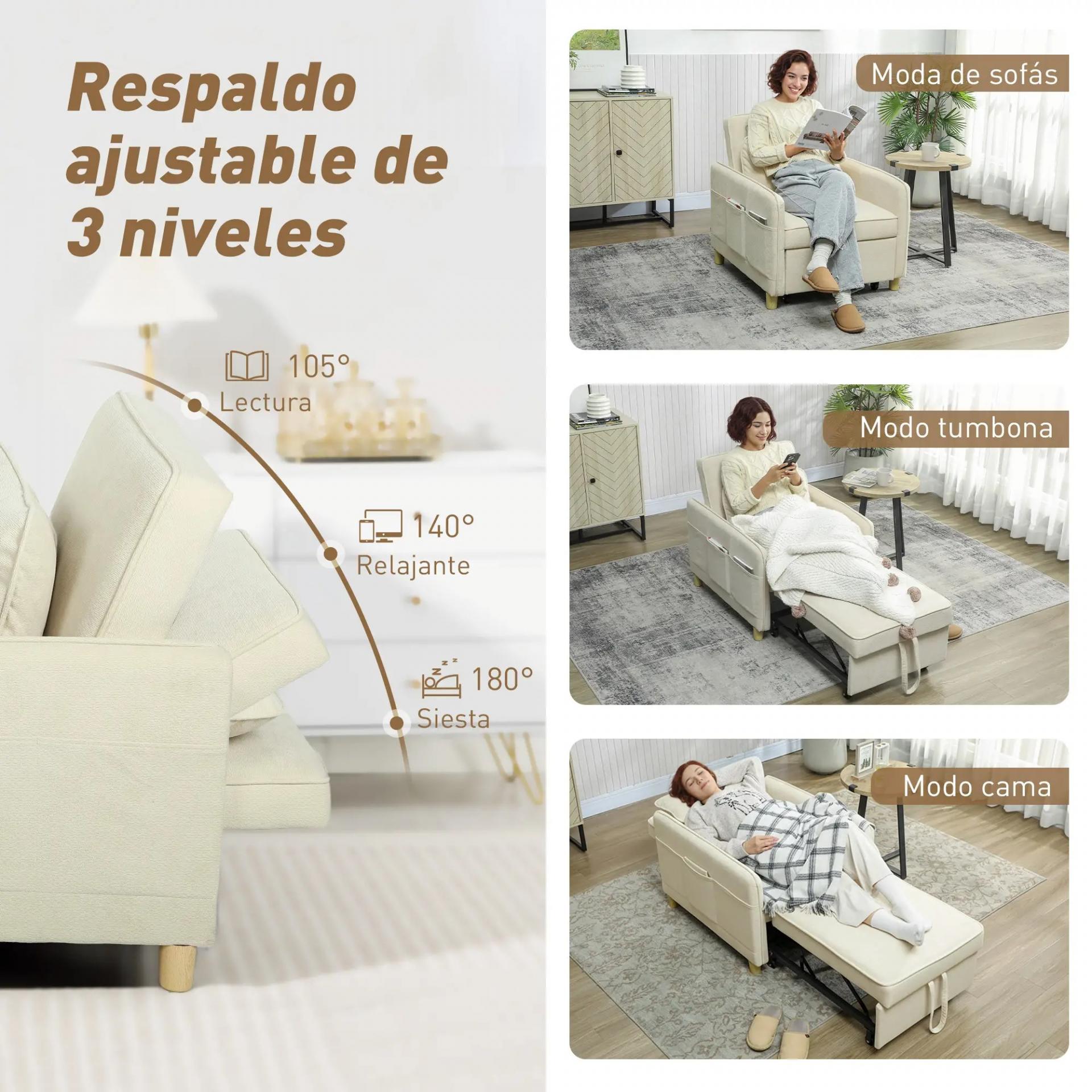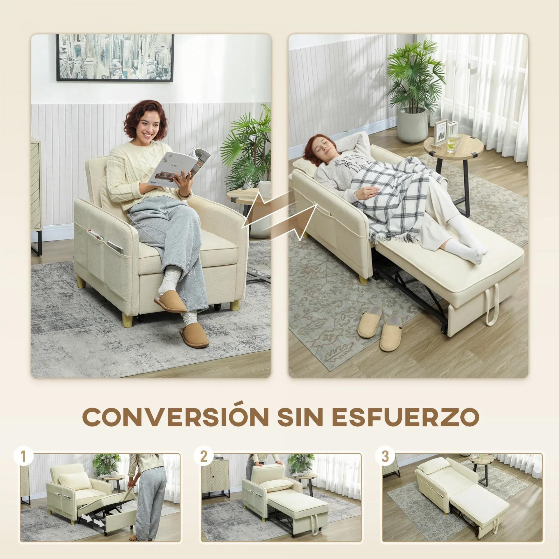 Sillón Cama Individual 3 en 1 Sofá Cama Plegable con Respaldo Ajustable y Cojín para Salón 74x85,5x82 cm Beige