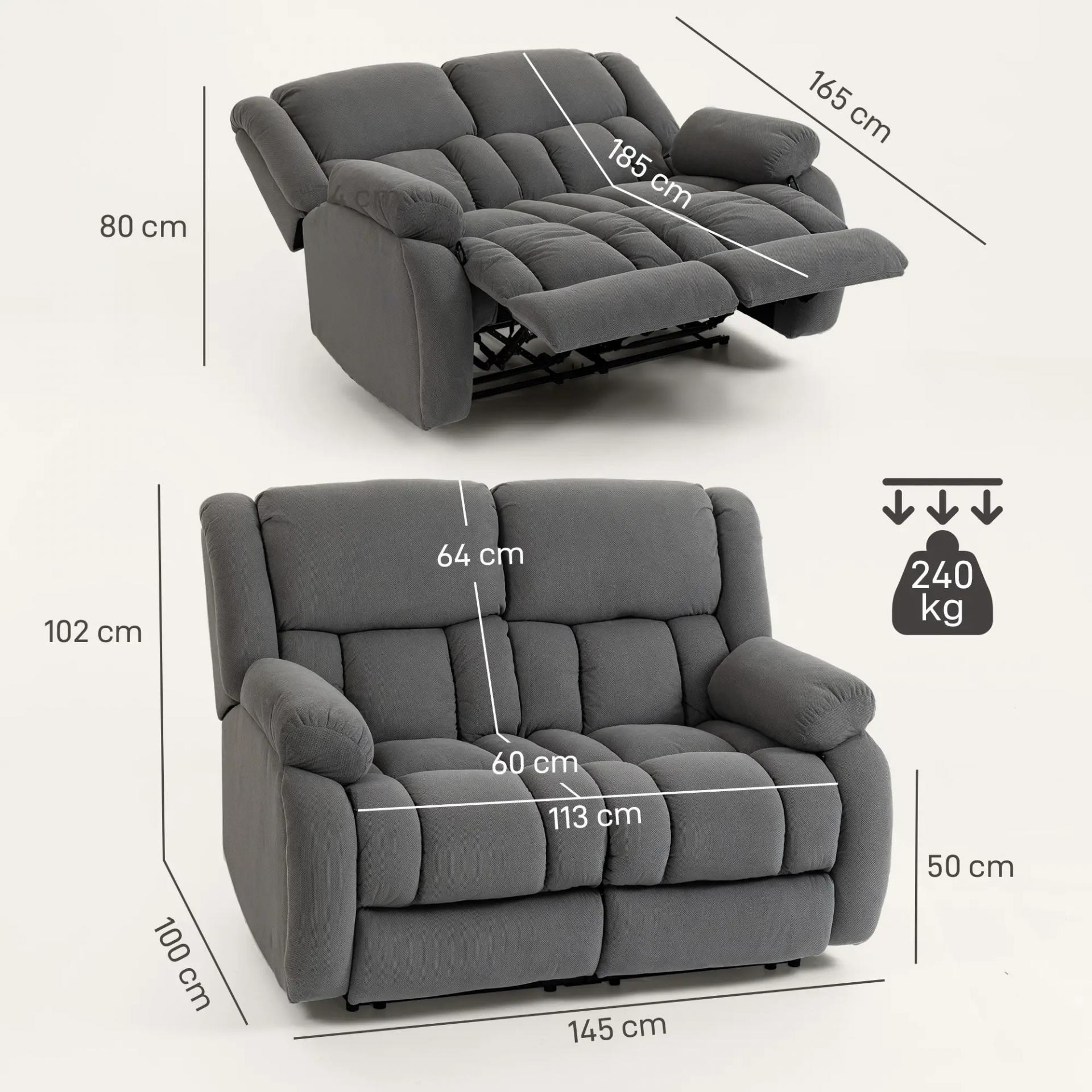 MEDIDAS TOTALES: 145x100x102 cm (vertical), 145x165x80 cm (reclinado). Asiento: 113x60x50 cm. Carga máxima: 240 kg (120 kg por asiento). Empuja el reposapiés con el talón hasta que quede bloqueado cuando no esté en uso