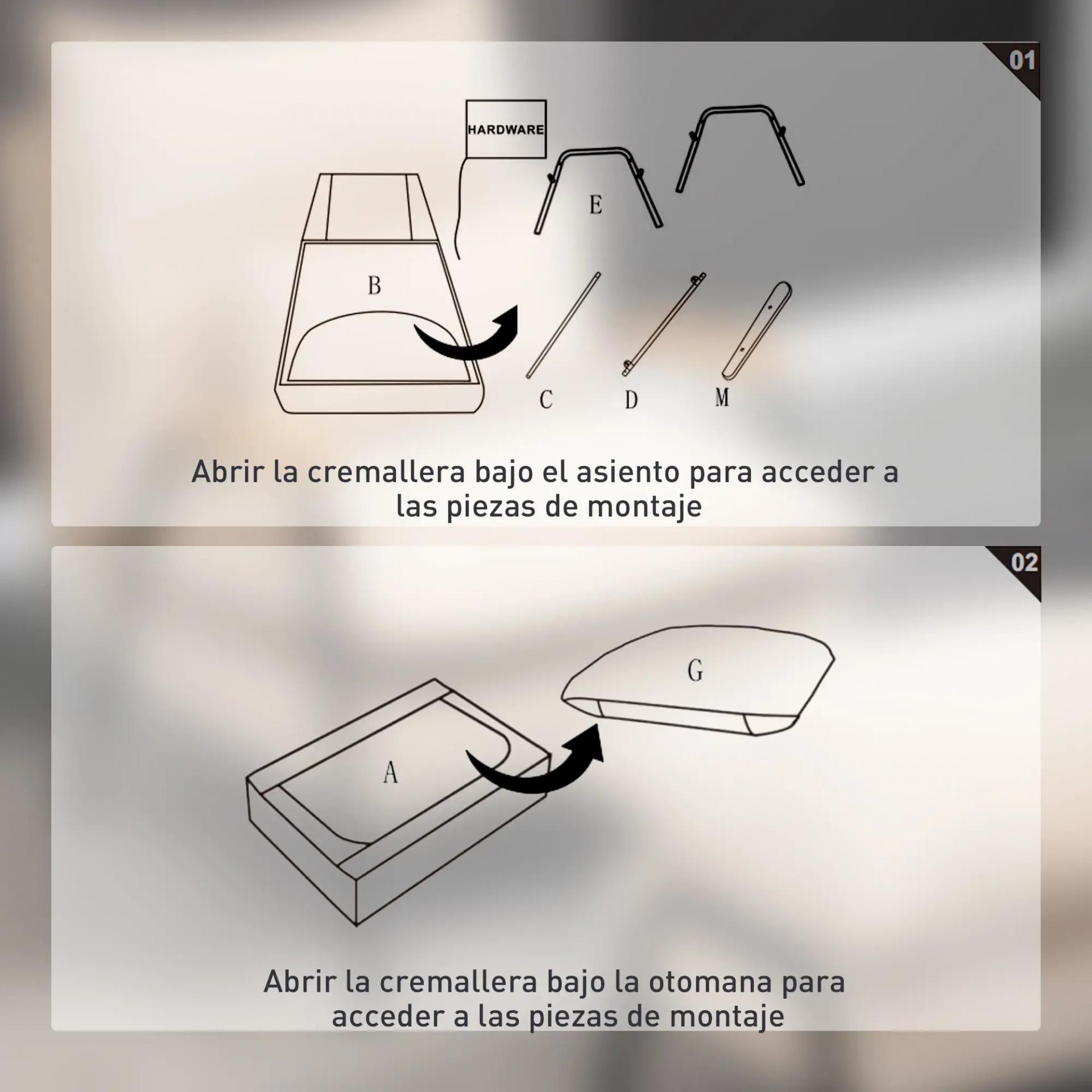 - ACCESORIOS DE MONTAJE: Los accesorios se guardan bajo el asiento y el reposapiés. Solo abre la cremallera de las fundas para acceder a ellos. Medidas totales: 68x91,5x88 cm (sillón) y 68x48x50 cm (reposapiés). Se requiere montaje