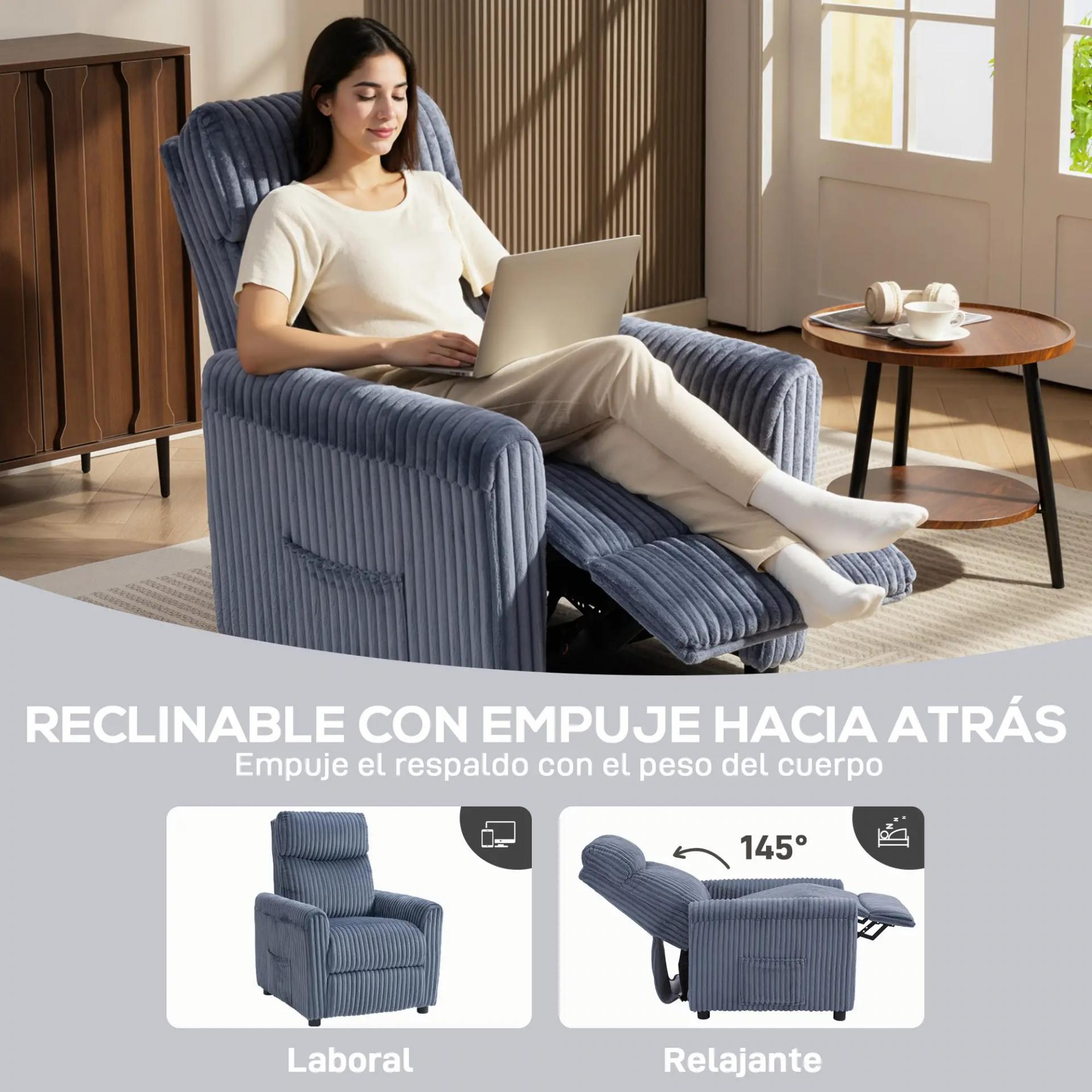 Sillón Relax Reclinable Manual Tapizado en Pana Instalación Rápida Reposapiés Acolchado Grueso Azul Oscuro