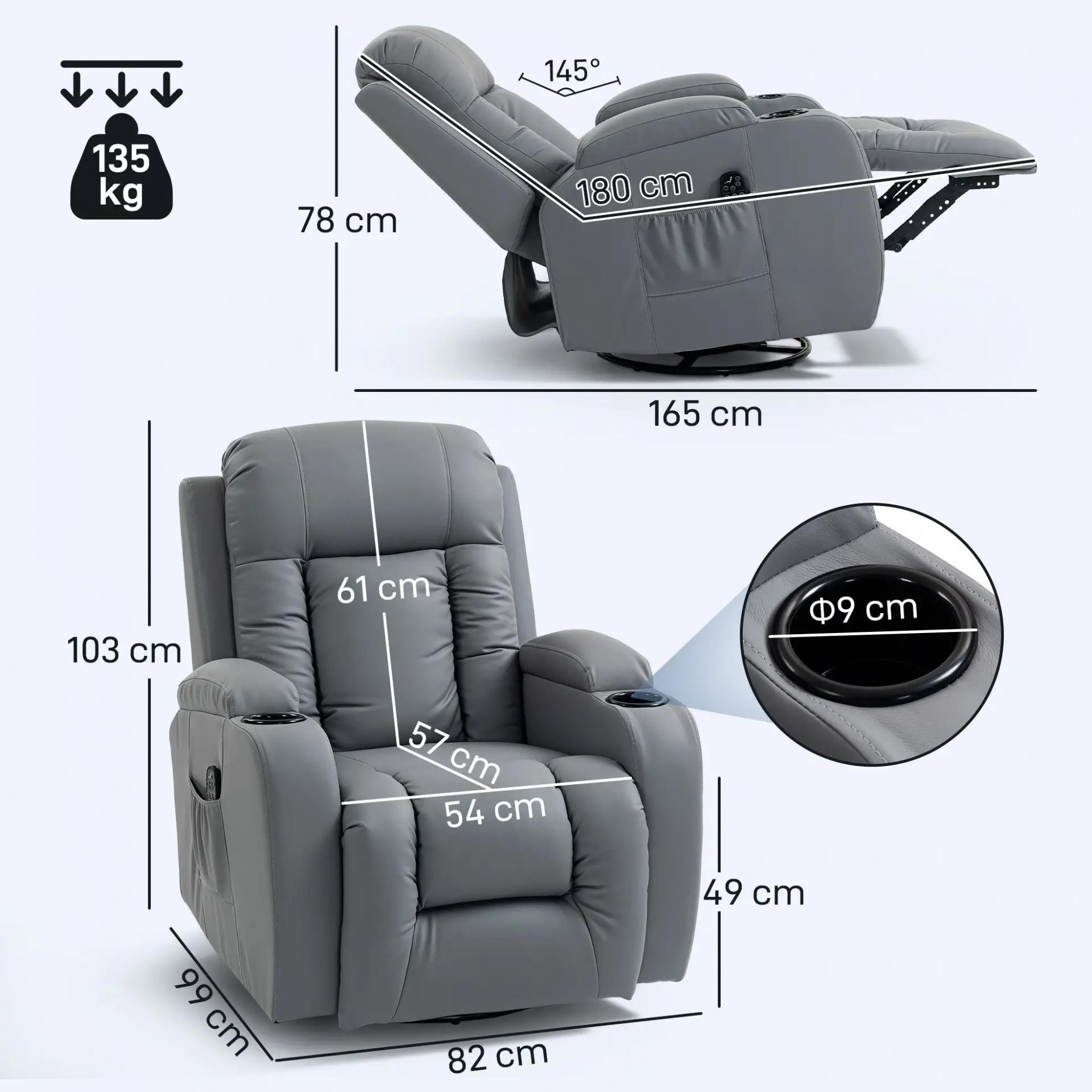 - MEDIDAS TOTALES: 82x99x103 cm (ANxPxAL). Medidas reclinado: 82x165x78 cm (ANxPxAL). El sillón relax reclinable soporta un peso máximo total de 135 kg