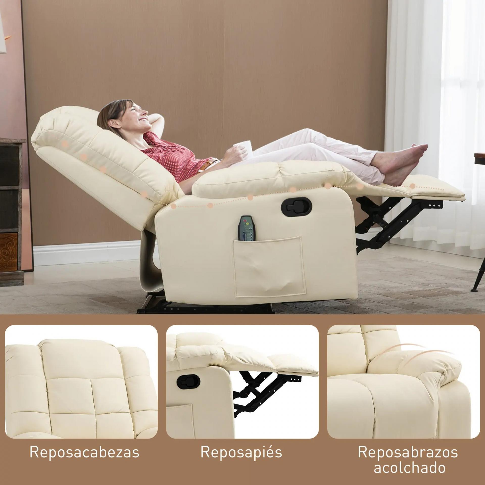 Sillón de Masaje Reclinable con 8 Puntos de Masaje Mando a Distancia Tapizado en PU Reposapiés Bolsillo Lateral Crema