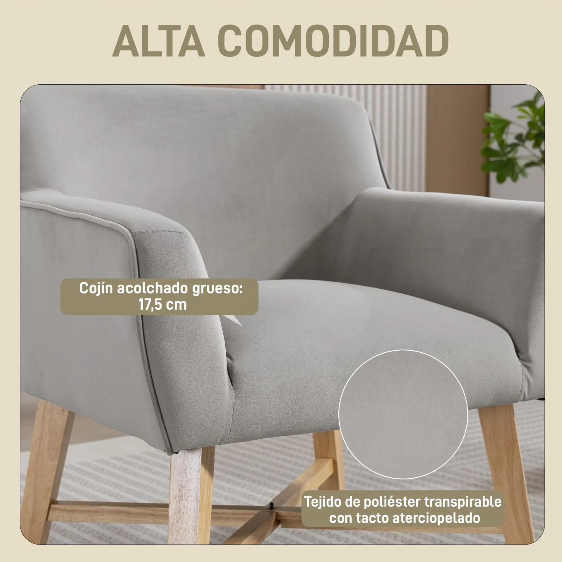 Butaca de Salón Tapizada en Terciopelo con Reposabrazos Acolchados y Patas de Madera Cruzadas 67x65x74 cm Gris Claro