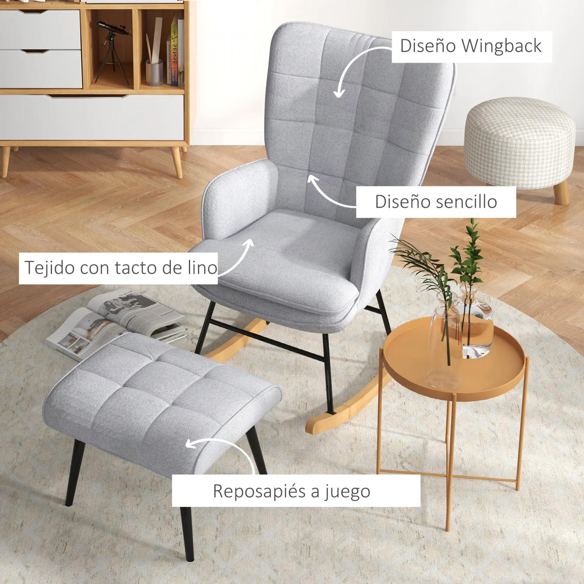 APORTA ELEGANCIA A TU HOGAR: Este sillón mecedora con reposapiés de color gris claro combina estilo y funcionalidad. Su diseño de respaldo alado añade un toque elegante, convirtiéndose en una pieza destacada que realza cualquier espacio de tu hogar