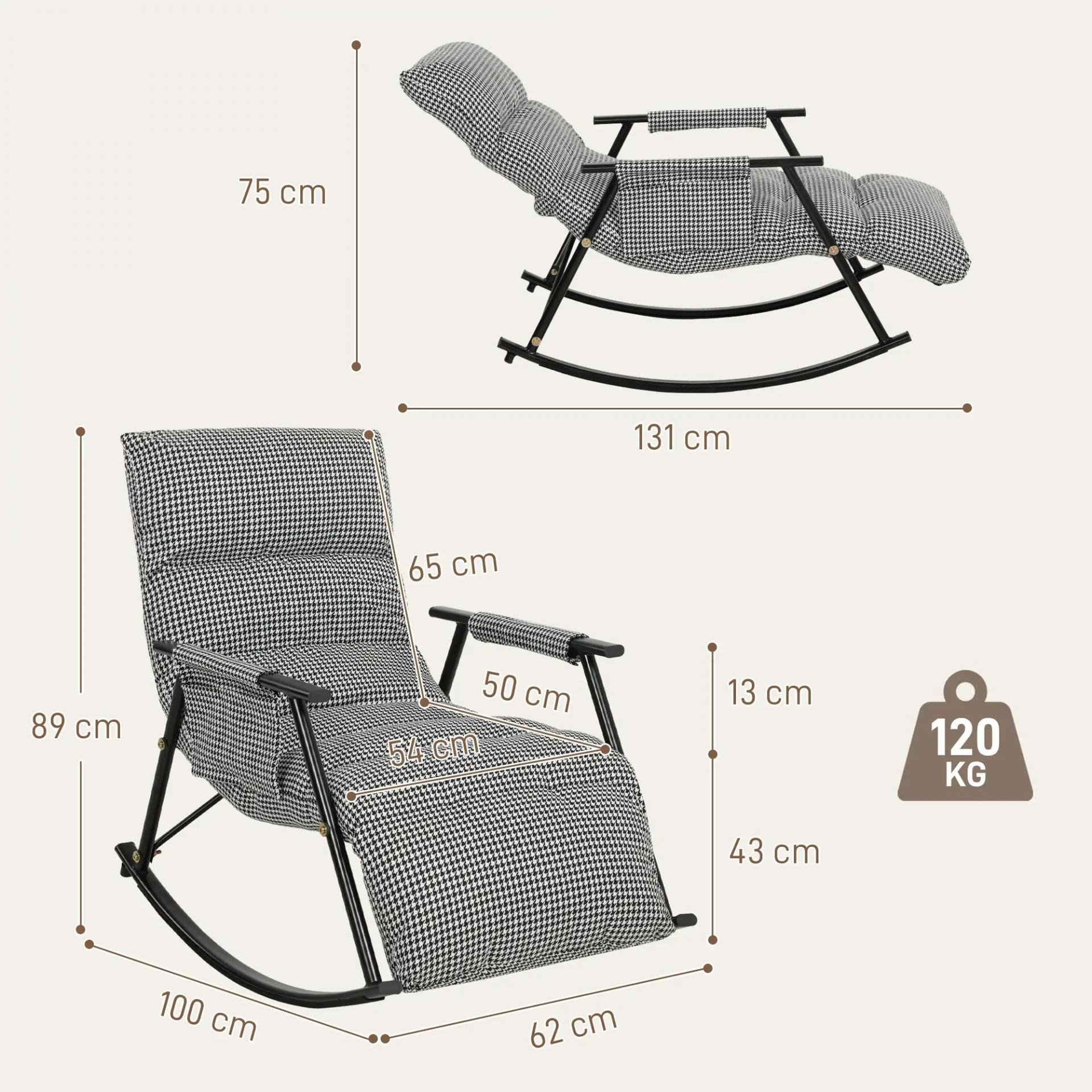 - MEDIDAS TOTALES: Esta silla mecedora reclinable mide 62x100x89 cm en posición vertical y 62x131x75 cm reclinada. Soporta hasta 120 kg y requiere montaje. Un asiento versátil, estable y cómodo, ideal para completar tu dormitorio, salón o zona de lectura