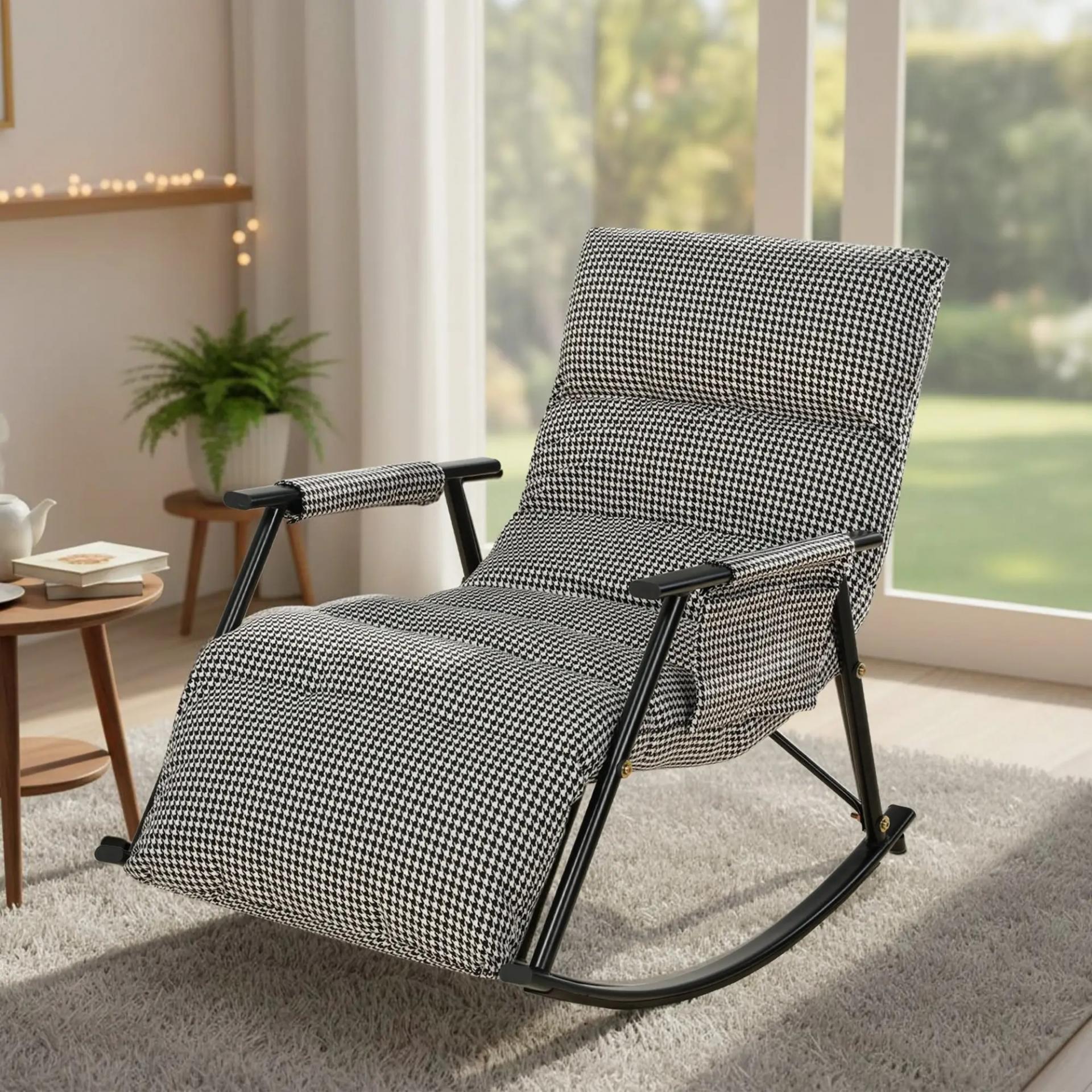 - BALANCEO SUAVE: La silla mecedora permite relajarse con un movimiento estable de 105°, gracias a su diseño optimizado. Su estructura metálica resistente soporta hasta 120 kg, garantizando seguridad, firmeza y una experiencia de balanceo muy agradable