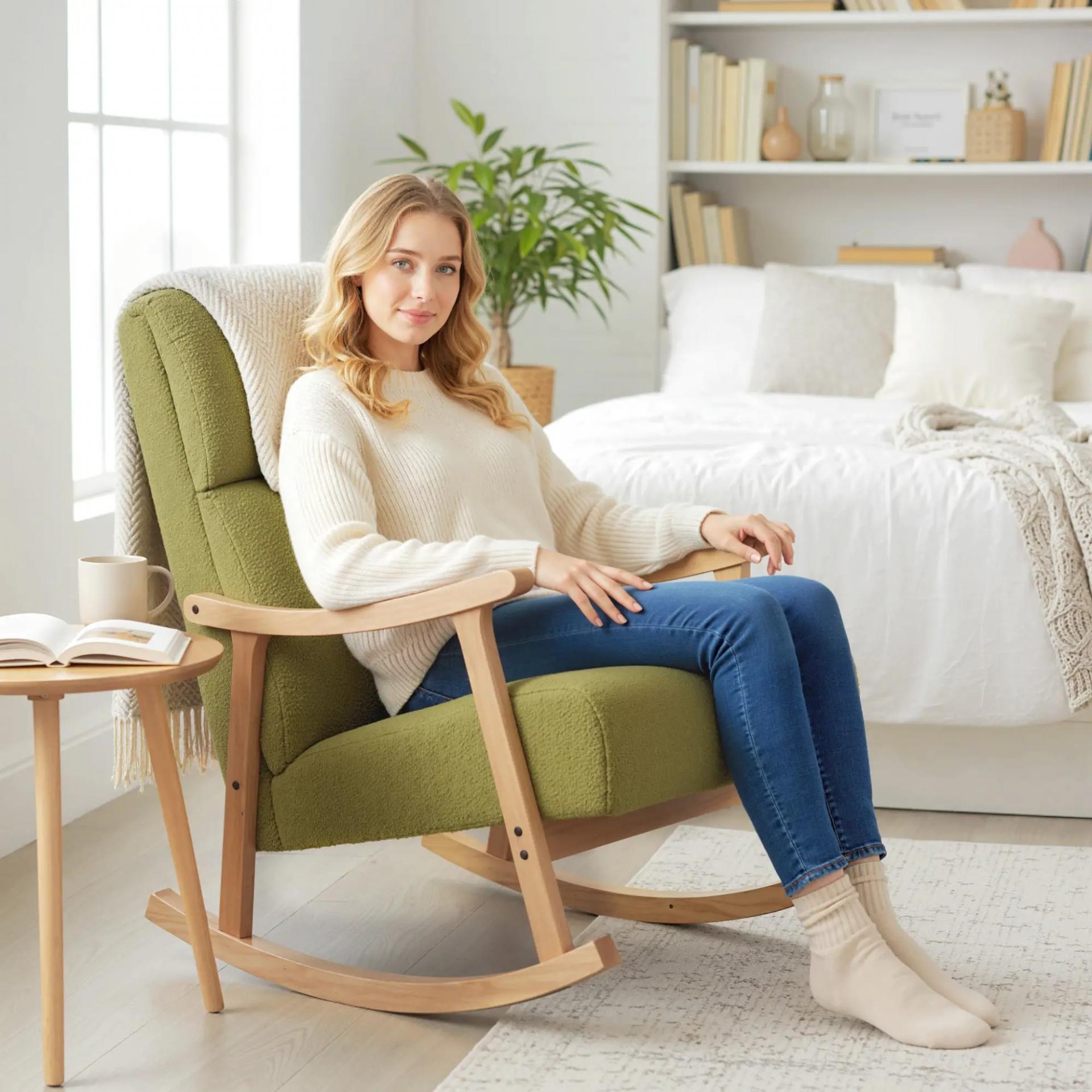 Silla Mecedora de Borreguito con Patas y Reposabrazos de Madera de Caucho Mecedora Carga 120 kg Verde Claro