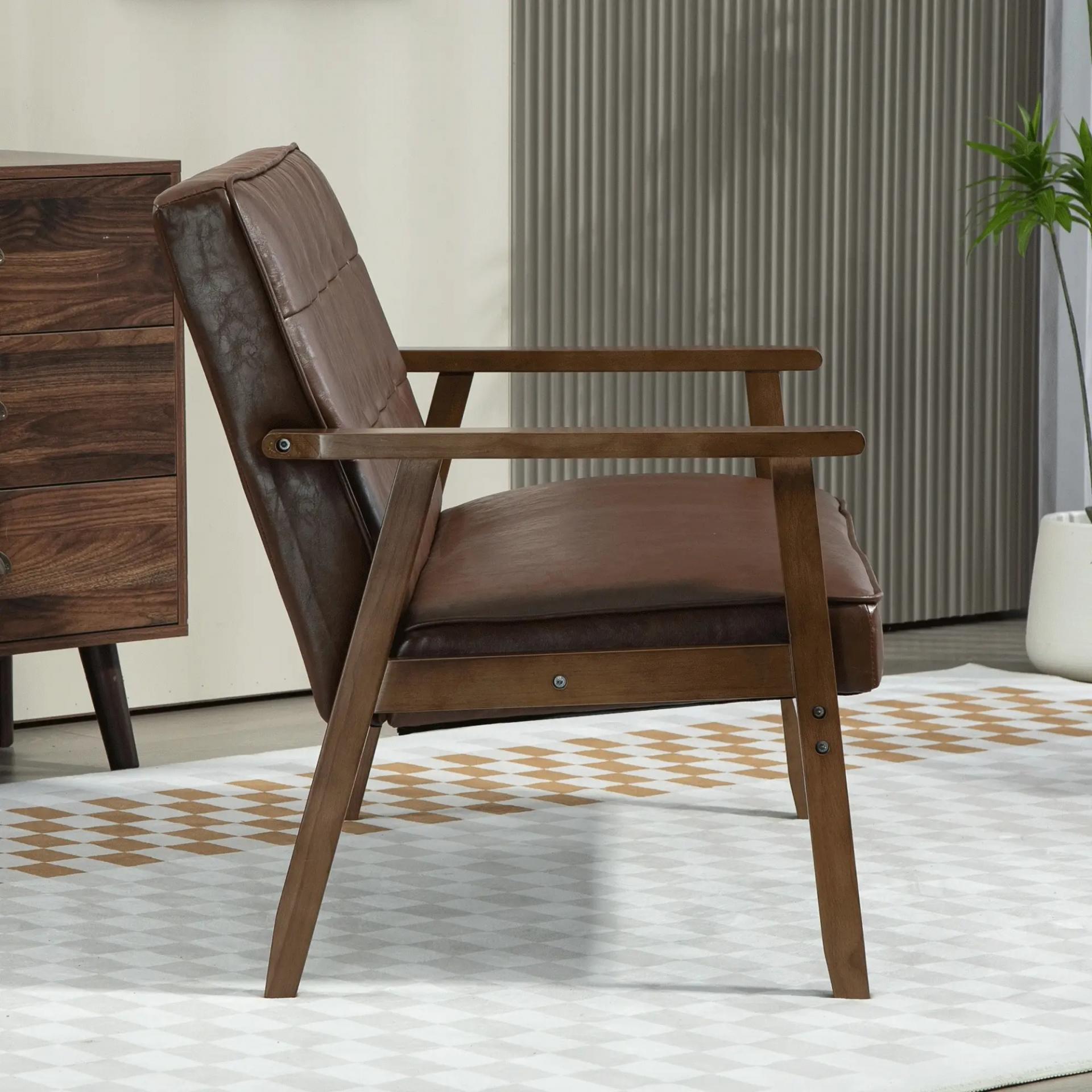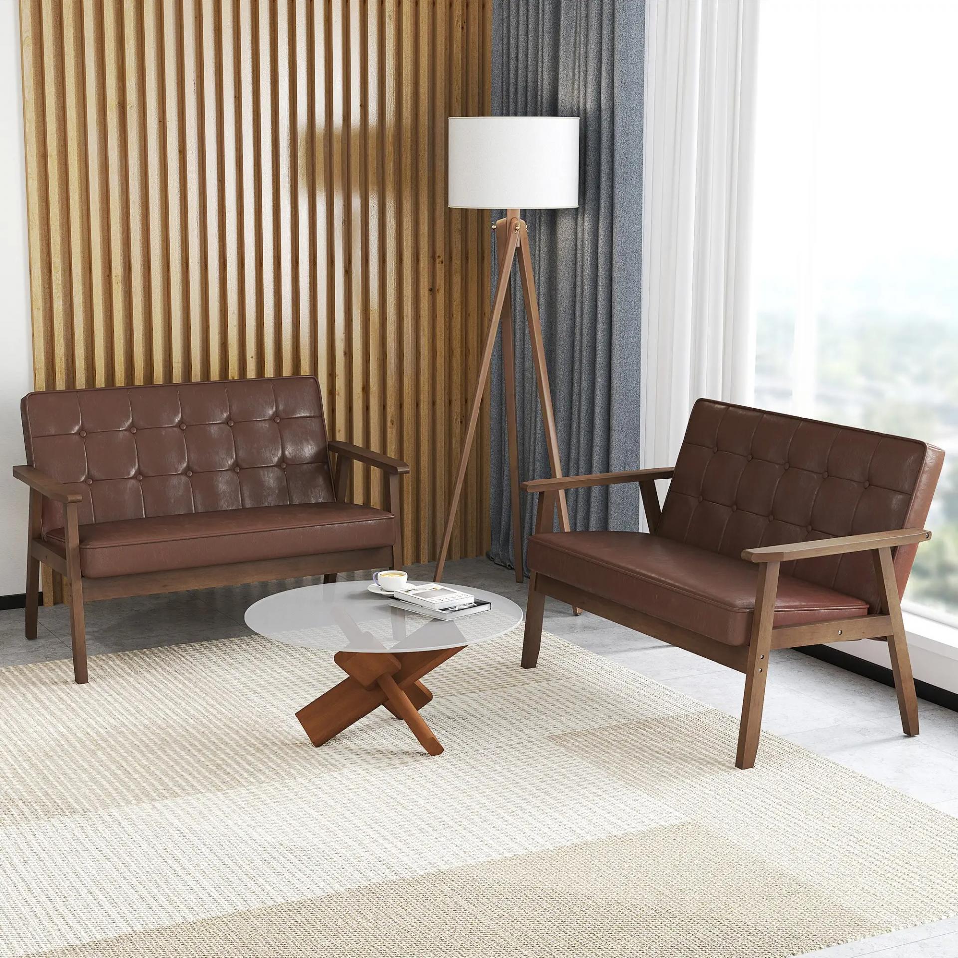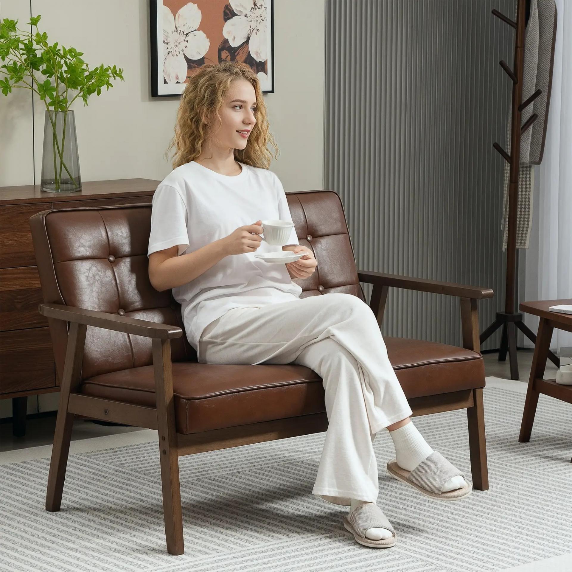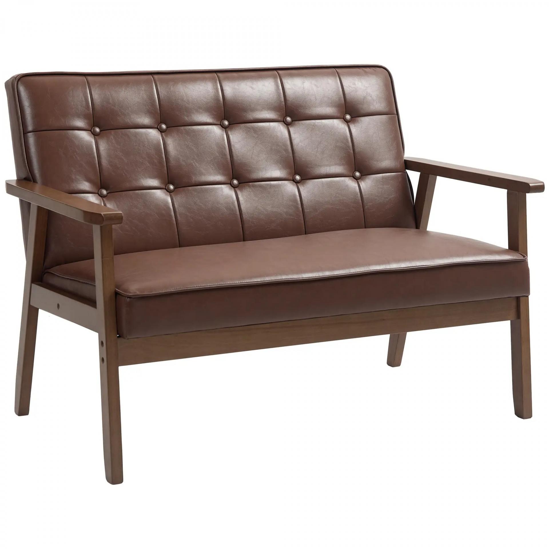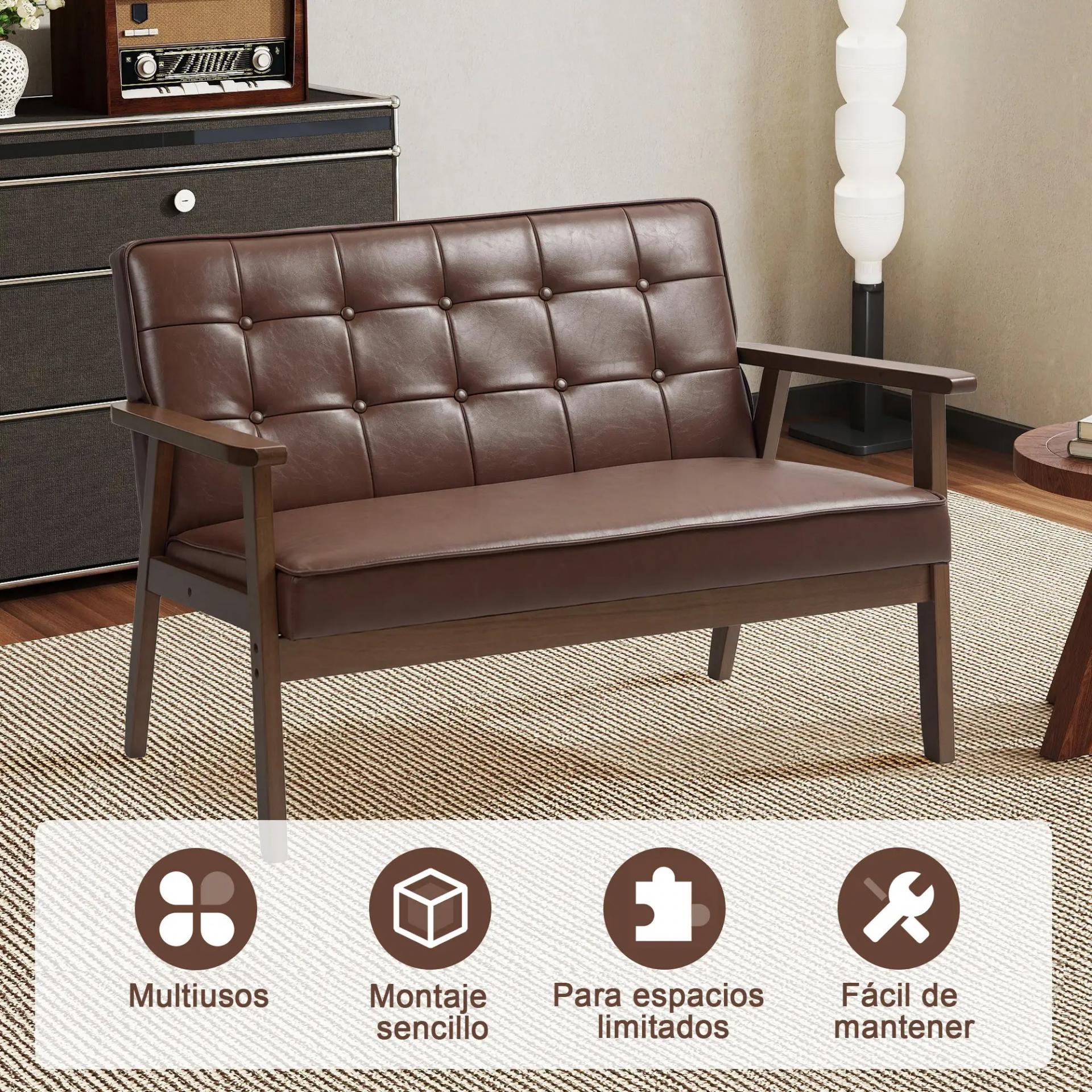 Sofá de 2 Plazas Tapizado en PU con Reposabrazos de Madera Respaldo Acolchado Carga 250 kg Marrón