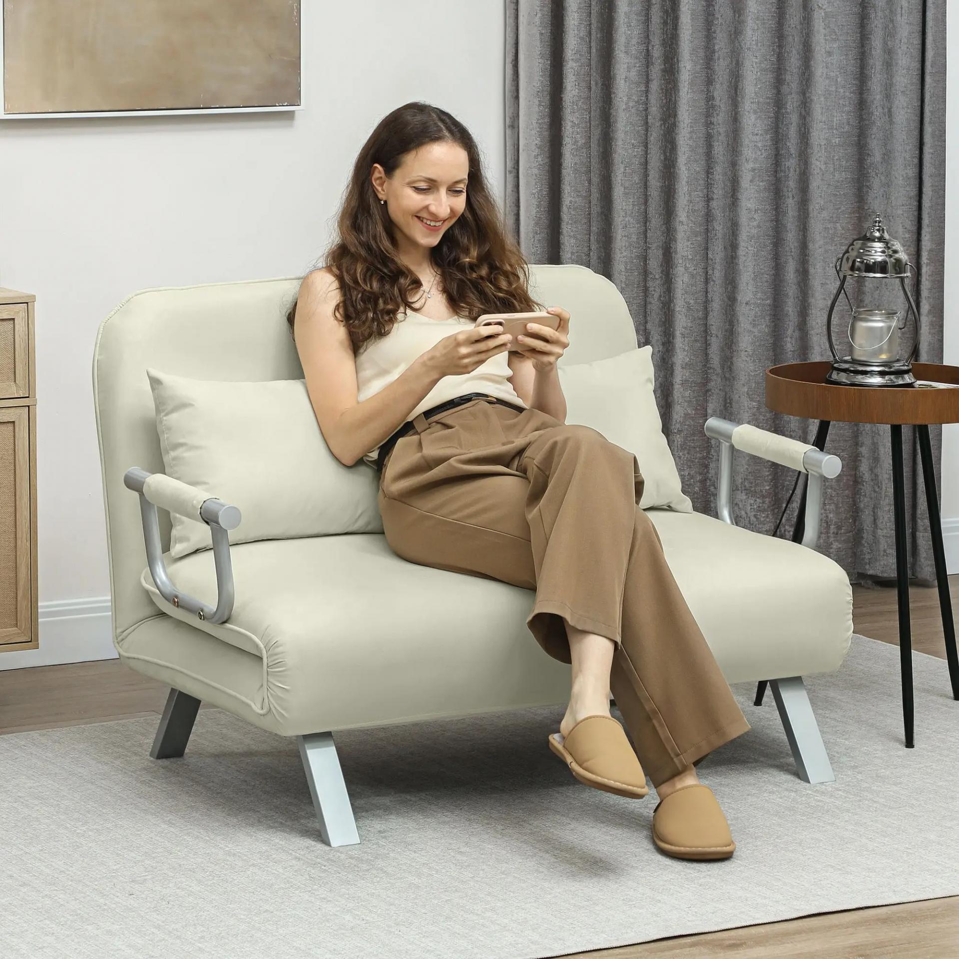 Sofá Cama de 2 Plazas con Respaldo Ajustable en 5 Posiciones Tapizado con Tacto de Ante y Cojines 111x80x78 cm Crema