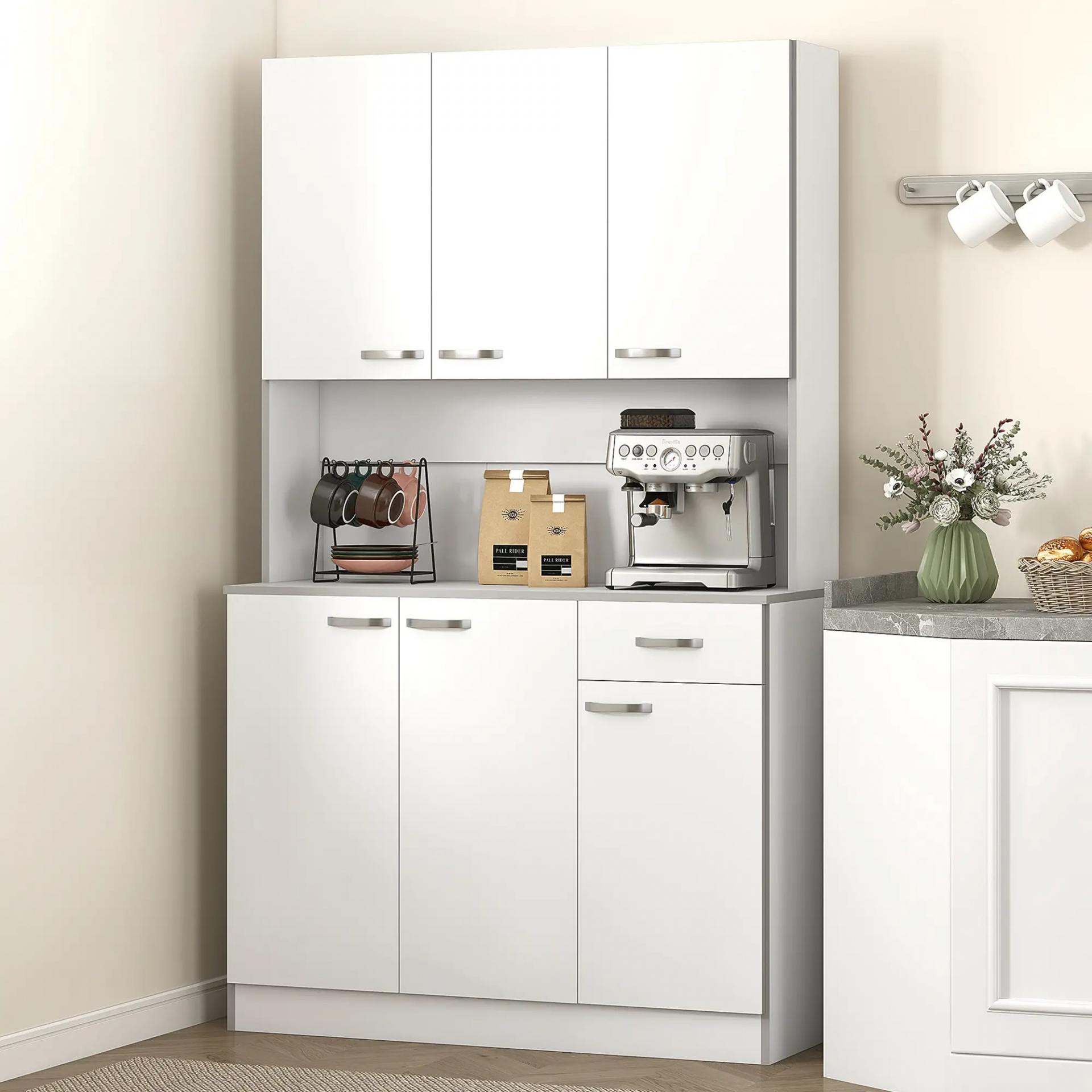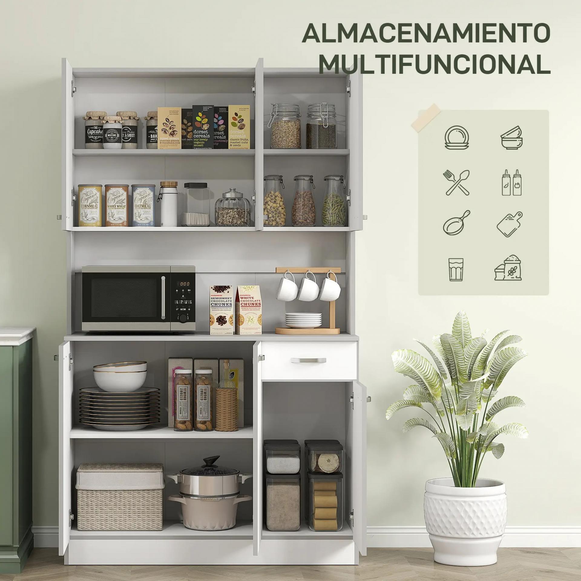- GRAN CAPACIDAD DE ALMACENAJE: Este compacto armario de cocina ofrece una increíble capacidad de almacenamiento. Cuenta con varios armarios con puertas, un cajón deslizante para almacenar alimentos o utensilios de mesa, y una encimera abierta de color gris, perfecta para el microondas, la cafetera y más