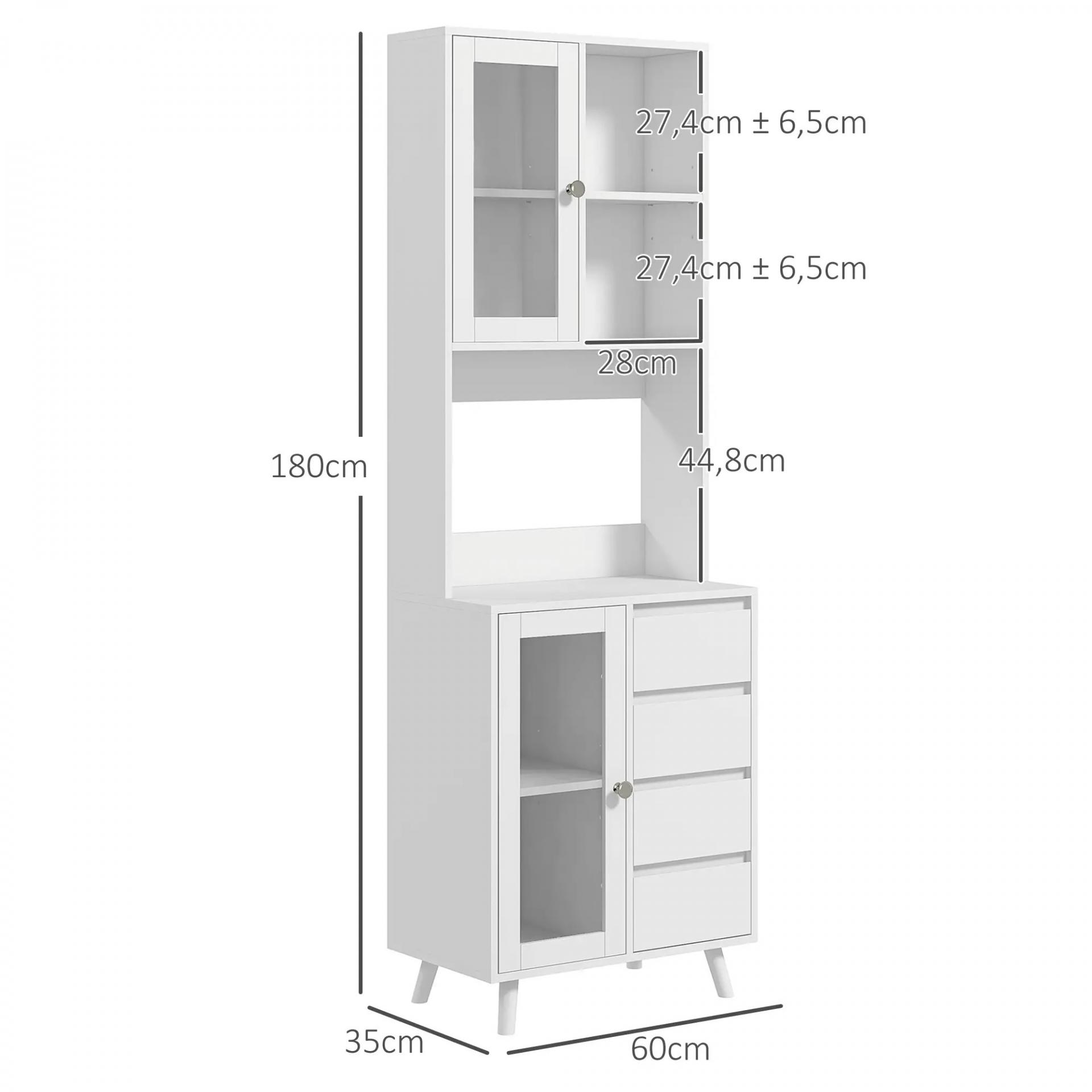 Alacena de Cocina Aparador con 2 Puertas de Vidrio Compartimentos 4 Cajones y Estantes Ajustables 60x35x180 cm Blanco