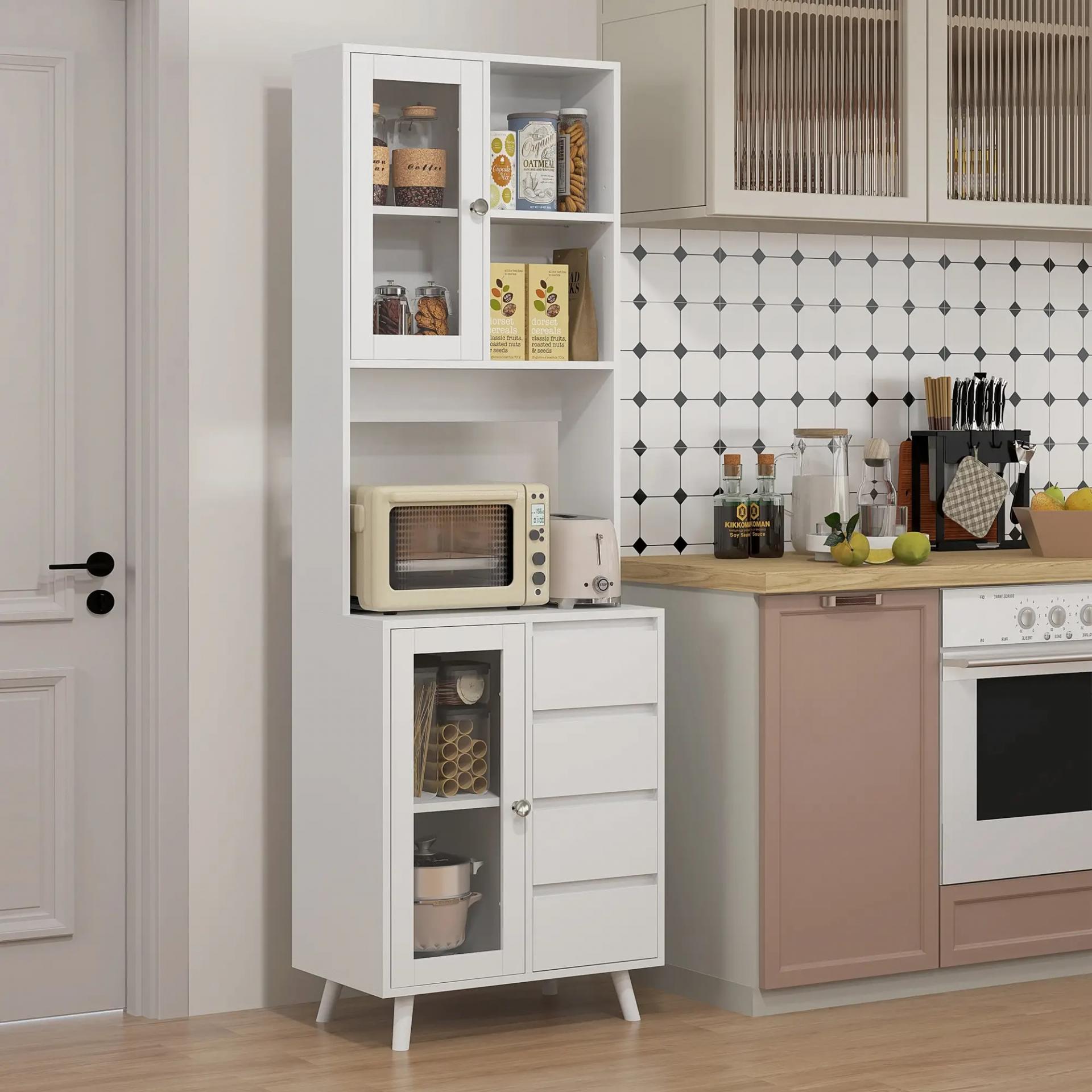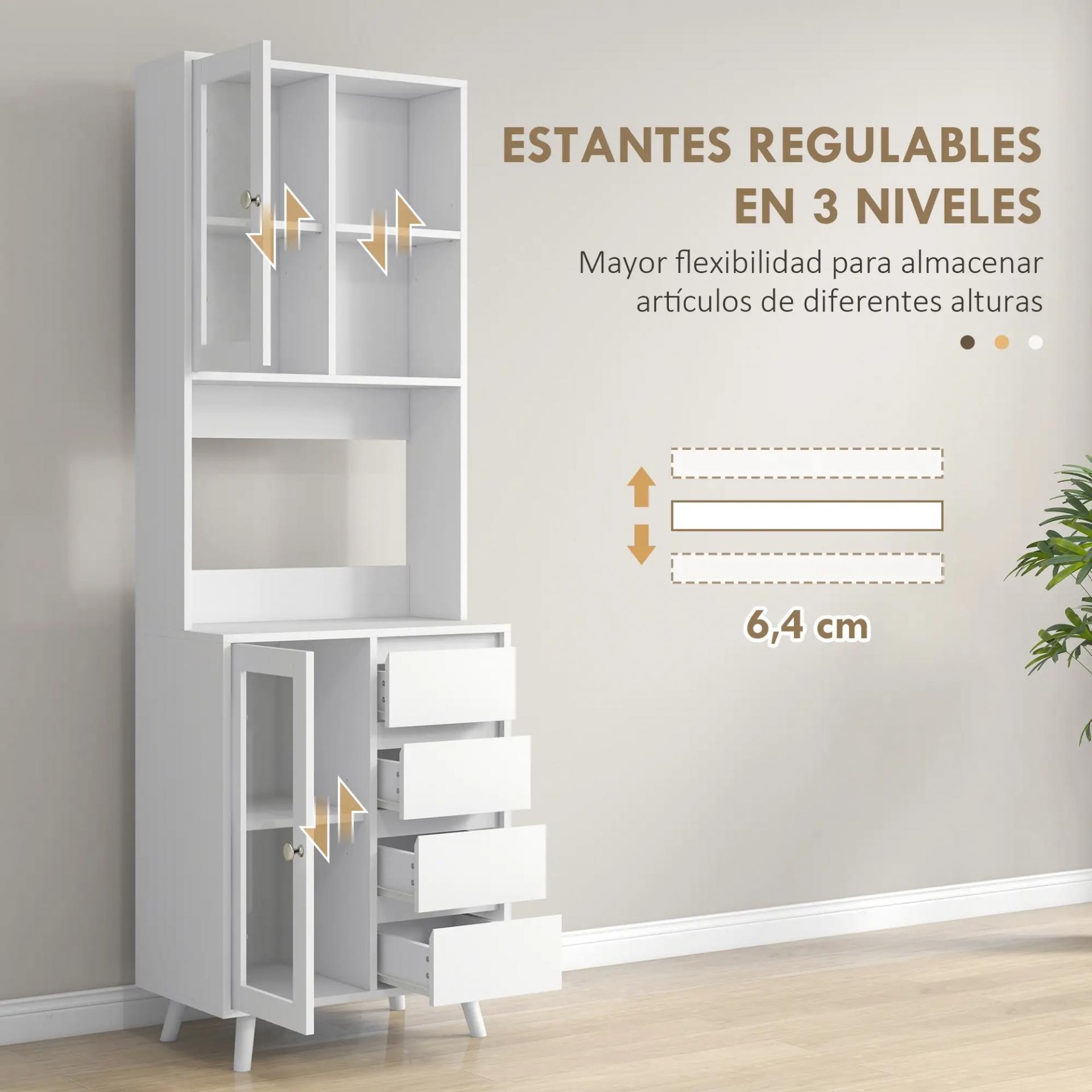 - PUERTAS DE CRISTAL: Exhibe tu vajilla más elegante, tus utensilios de cocina o cualquier objeto decorativo en los armarios con puerta de vidrio de este mueble auxiliar de cocina alto. Gracias al vidrio templado de las puertas podrás añadir un toque atractivo a tu cocina, además de facilitar la localización de cada artículo