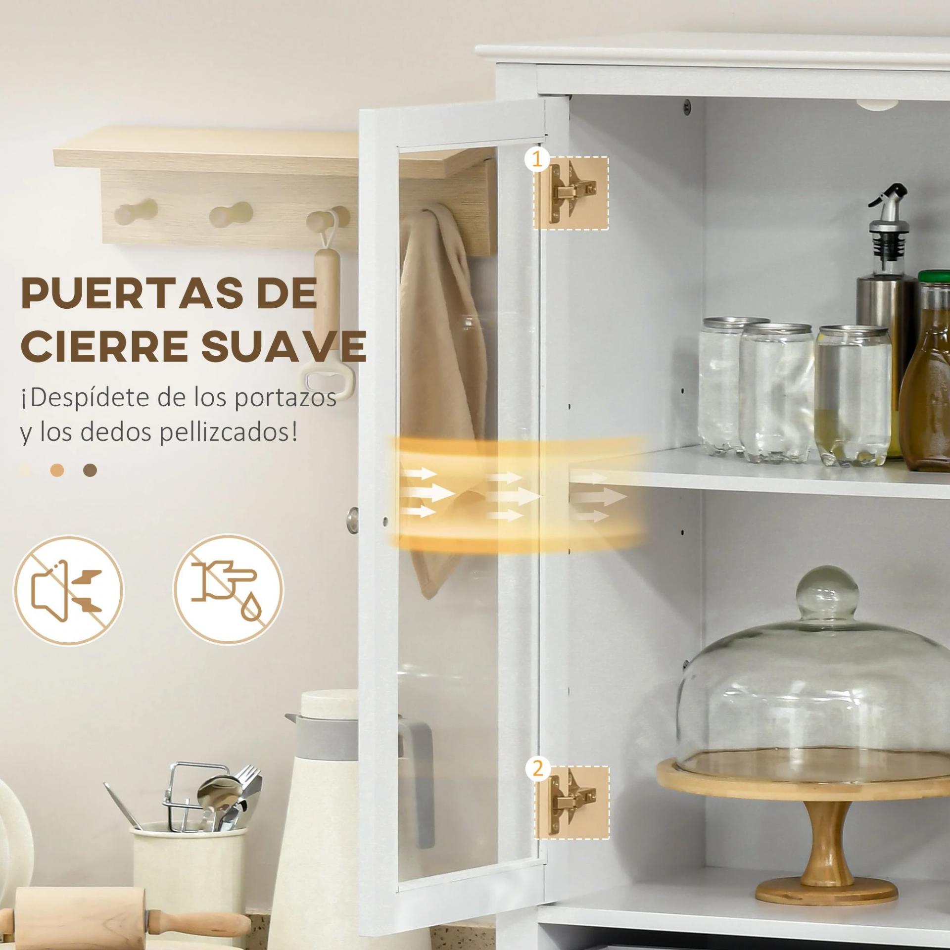 - 4 ESTANTES: Esta alacena alta ofrece un amplio espacio para almacenar y organizar diferentes tipos de objetos. Los 4 estantes son ideales para platos, tazas, alimentos, libros, objetos de decoración, entre otros. Tiene estantes regulables en altura para satisfacer tus diferentes necesidades y al tener puertas mantendrá tus objetos alejados del polvo