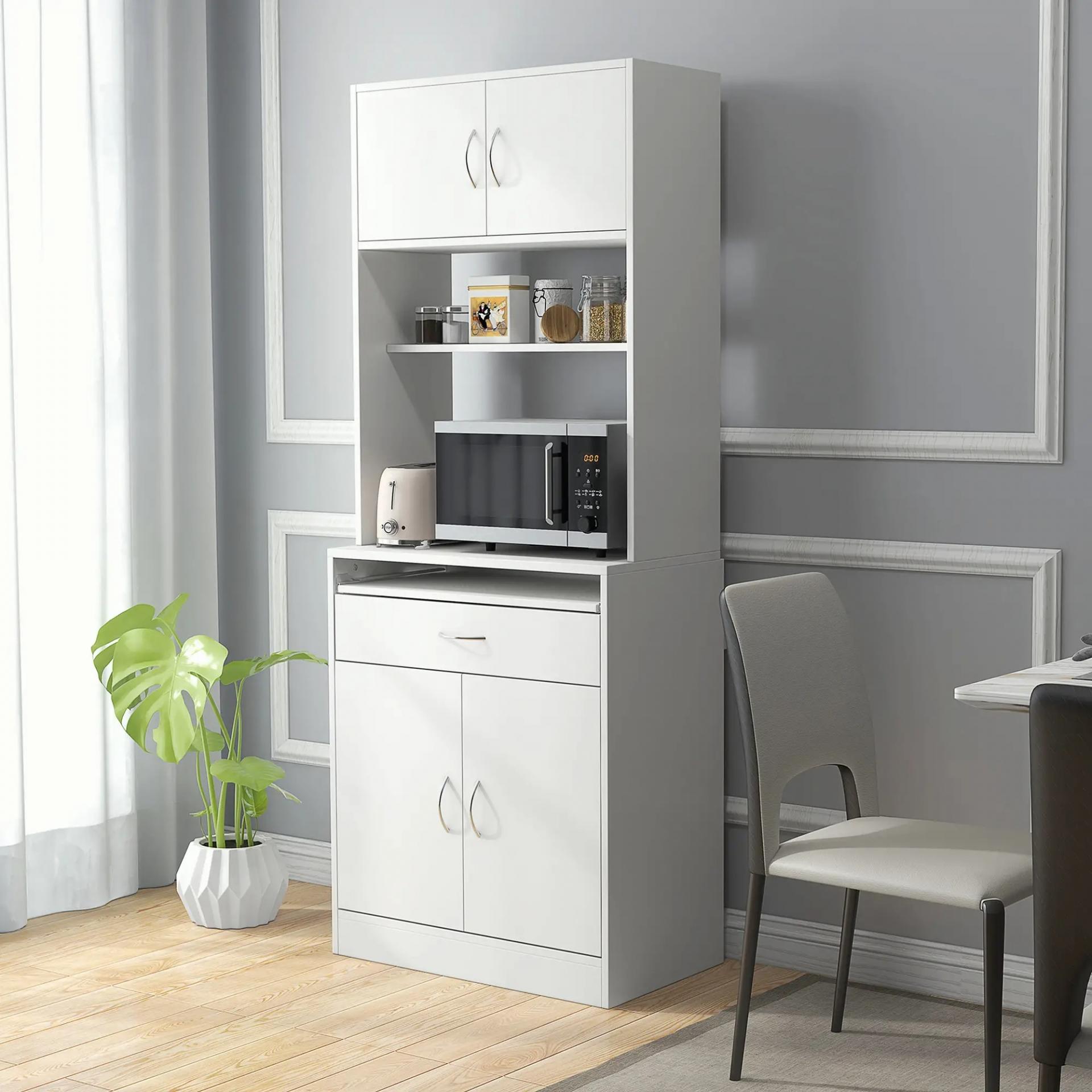 - MEJORA TU ALMACENAMIENTO: Este mueble de cocina tiene un amplio espacio de almacenamiento. Cuenta con 2 armarios con puerta, estante y repisa abierta, un cajón y una bandeja deslizante Ideal para guardar las ollas, sartenes, los cubiertos y trapos en el cajón o colocar el microondas o la cafetera encima de la repisa