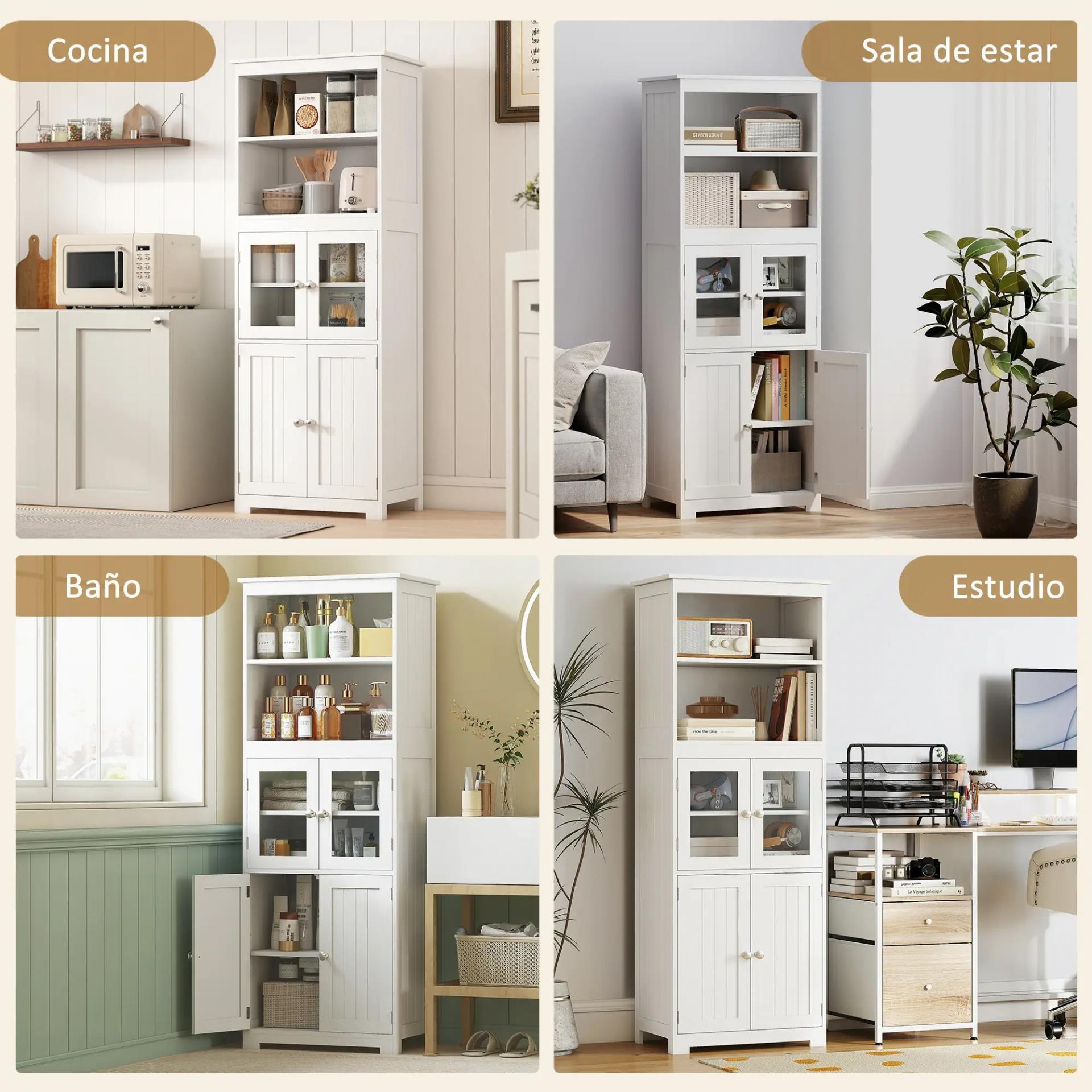 GRAN ESPACIO DE ALMACENAJE: Este mueble de cocina de almacenaje tiene un diseño compacto, cuenta con estantes de dos niveles y dos armarios de doble puerta, uno de ellos, con las puertas de cristal. Ahorra espacio al mismo tiempo que ofrece suficiente espacio para almacenar tus platos favoritos, productos enlatados, utensilios de cocina y más