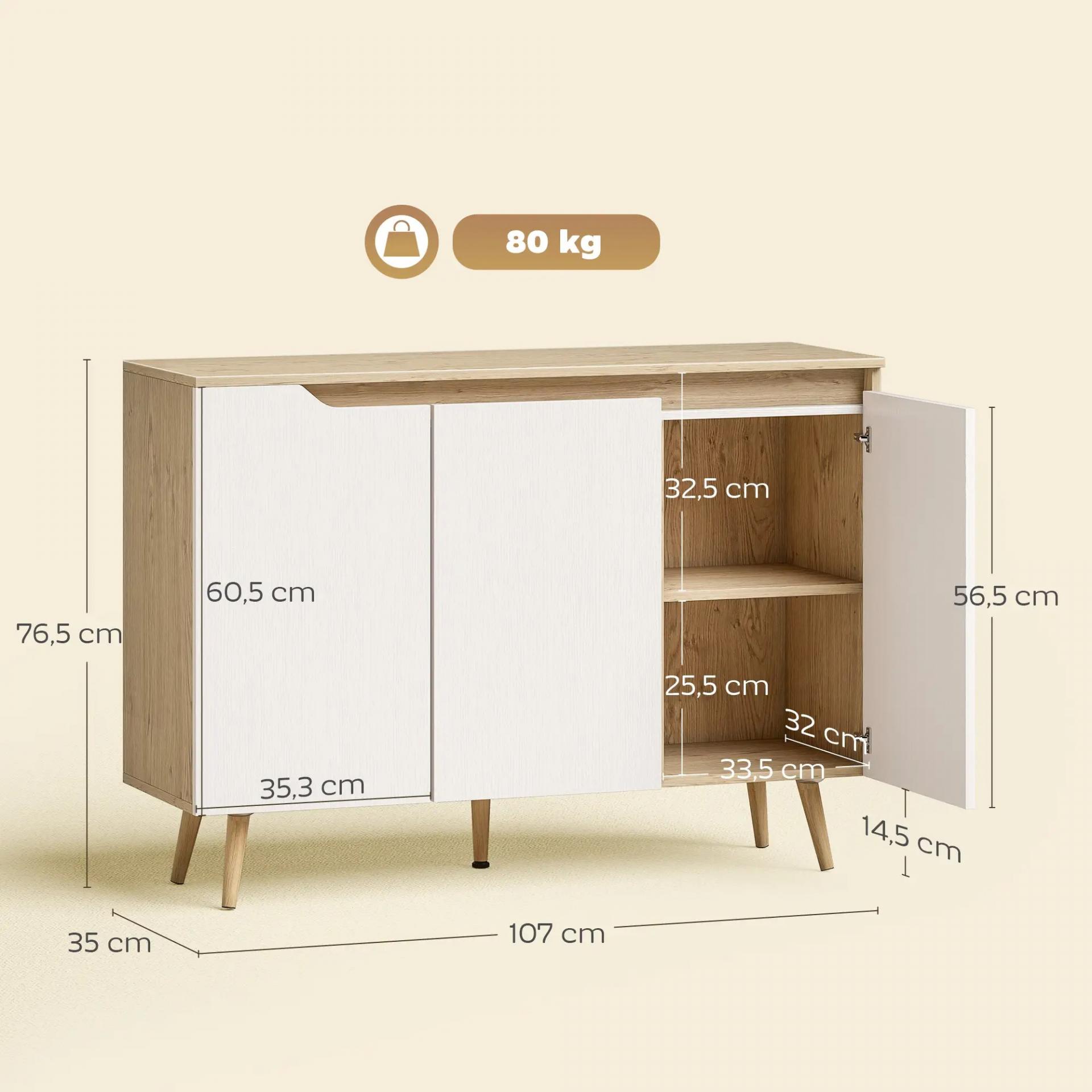 Aparador de Salón con 3 Puertas Estantes Ajustables Patas de Madera para Cocina Entrada 107x35x76,5 cm Roble y Blanco