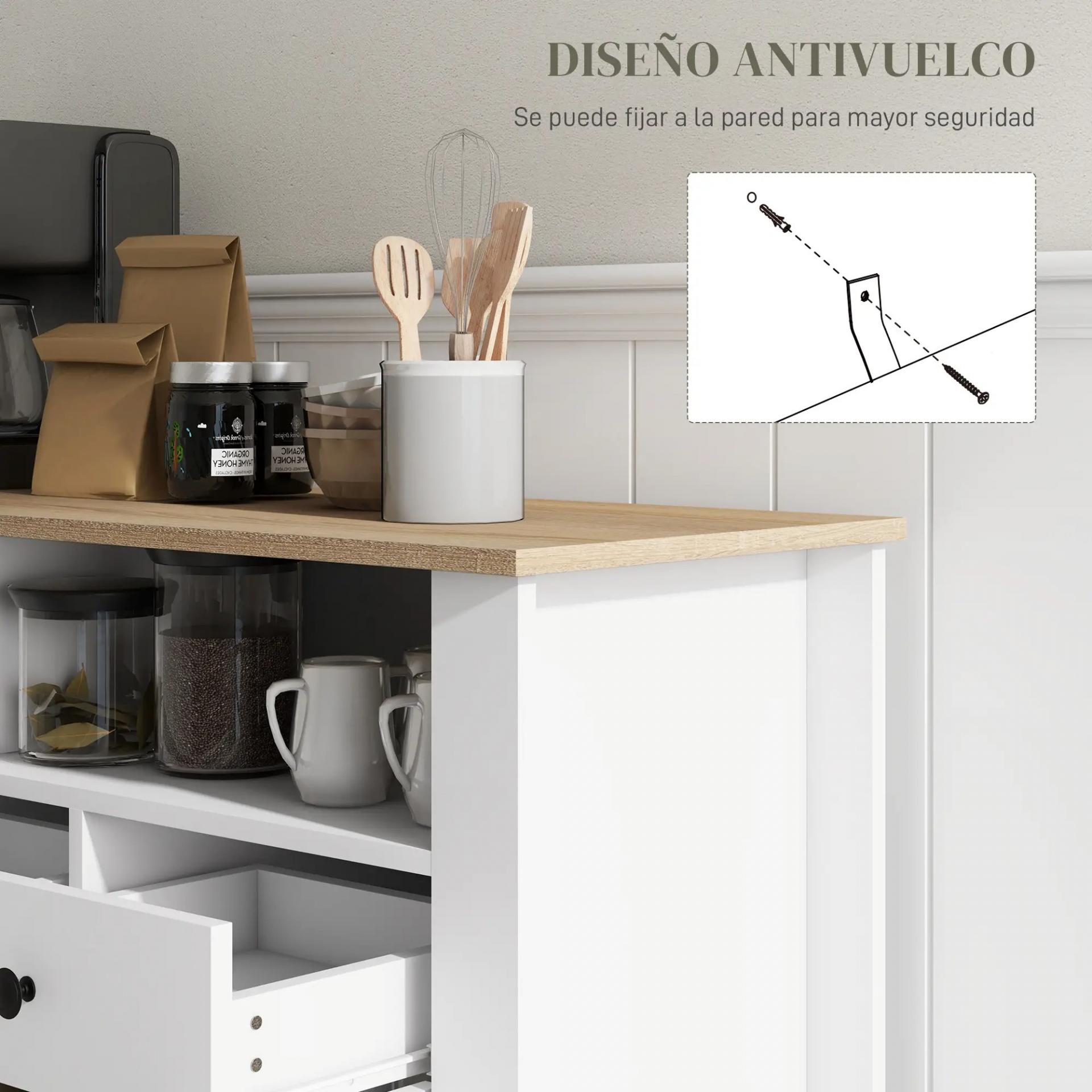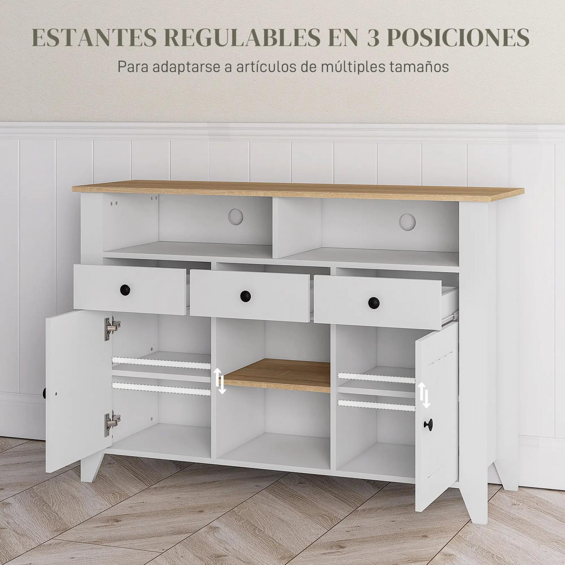- SOLUCIÓN DE ALMACENAMIENTO VERSÁTIL: Este aparador de cocina cuenta con cuatro estantes abiertos, tres cajones y dos armarios con estantes ajustables, perfectos para organizar tus suministros diarios en la cocina, el comedor o el pasillo. Con su altura de 81,5 cm, es ideal para usarlo como encimera en la cocina