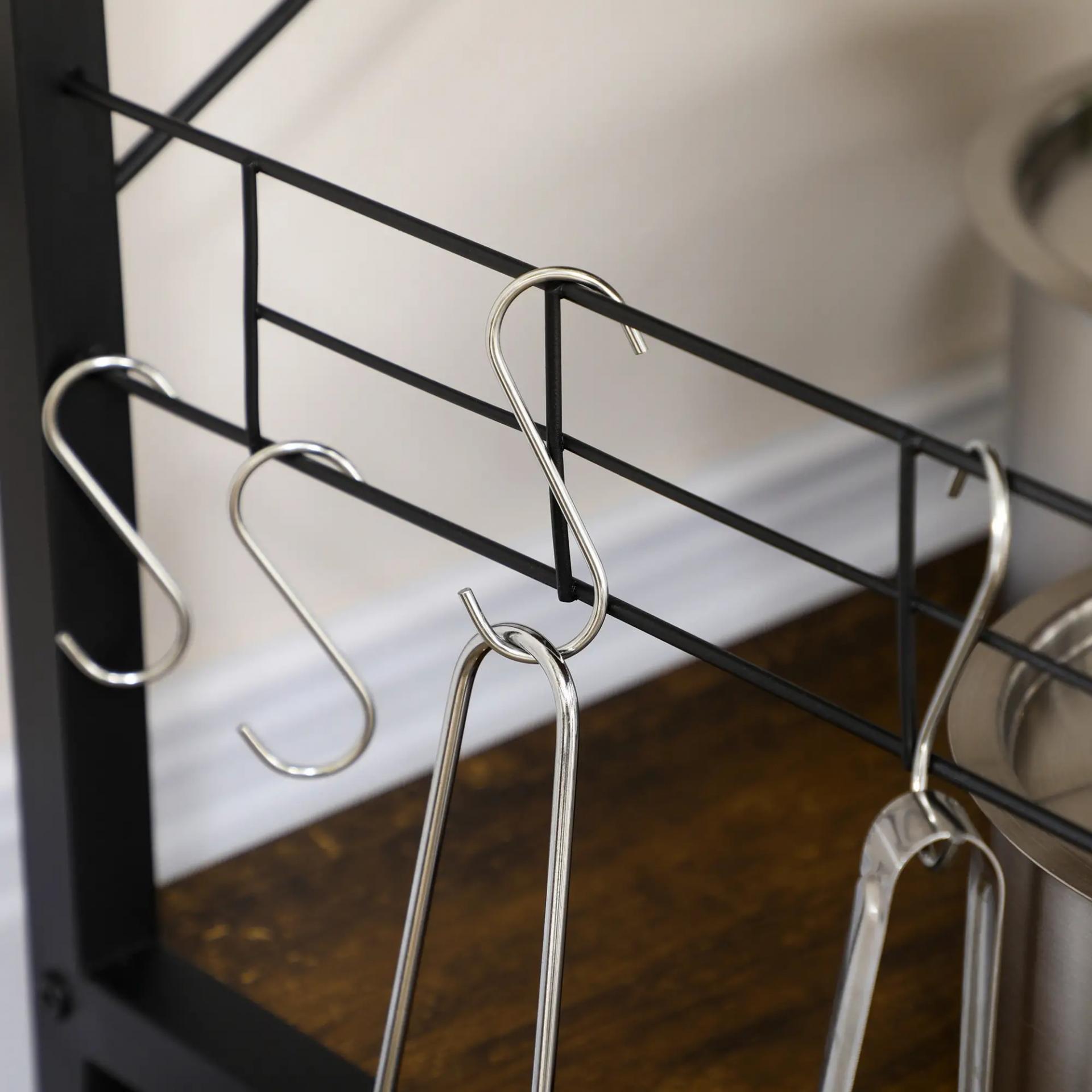 - - GRAN ESPACIO DE ALMACENAJE: ¡Di adiós al desorden! Esta solución de almacenamiento cuenta con una gran superficie de trabajo apta para microondas, estantes (incluido un estante ajustable), una cesta extraíble de metal y cinco ganchos en forma de S, lo que ofrece un amplio espacio de almacenamiento para todos tus utensilios de cocina, comestibles y más