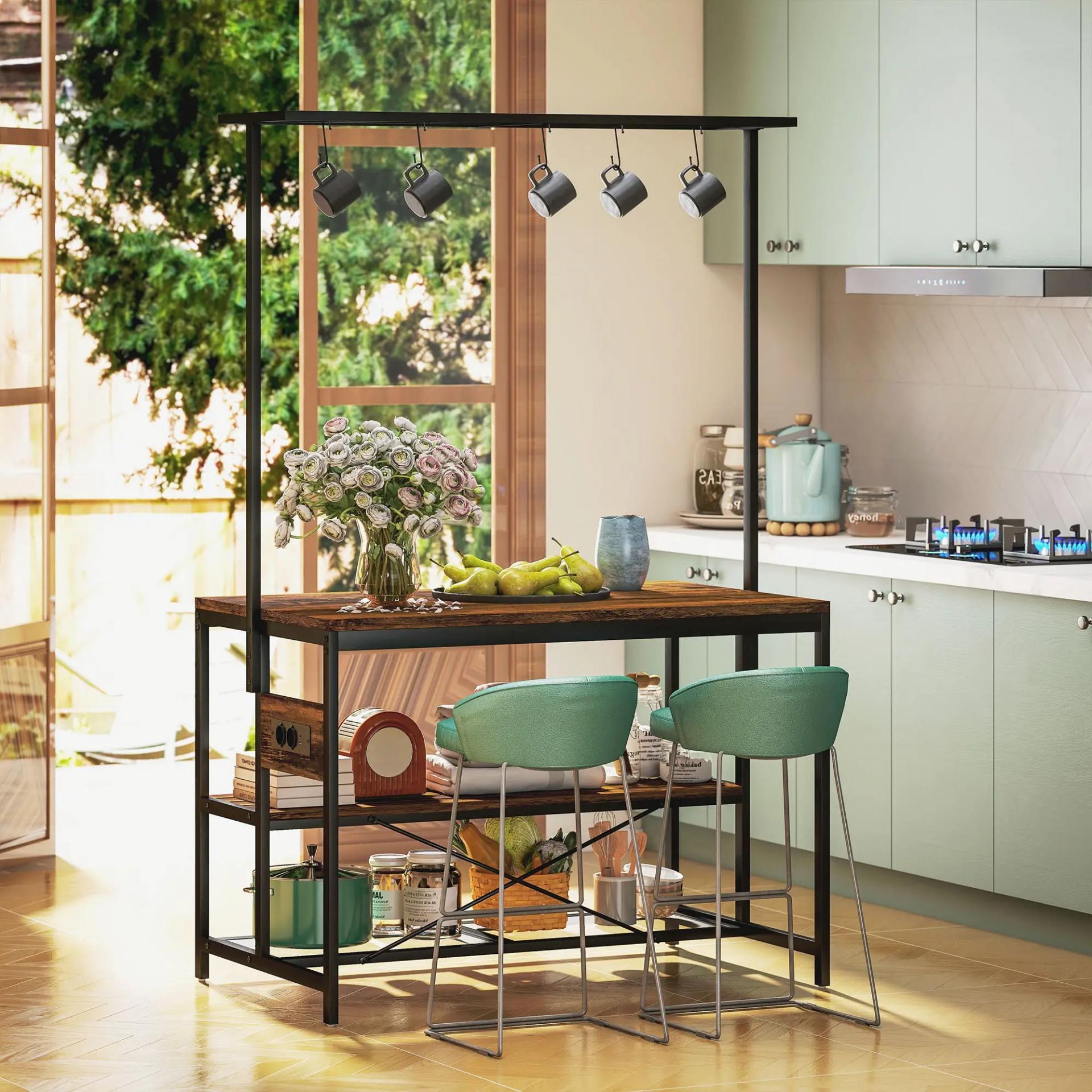 - - MESA BAR ACOGEDORA: Funciona como barra de desayuno con espacio para dos taburetes (no incluidos). Disfruta de café y charlas. Quita la balda superior para usarla como soporte para microondas, horno o para almacenamiento extra