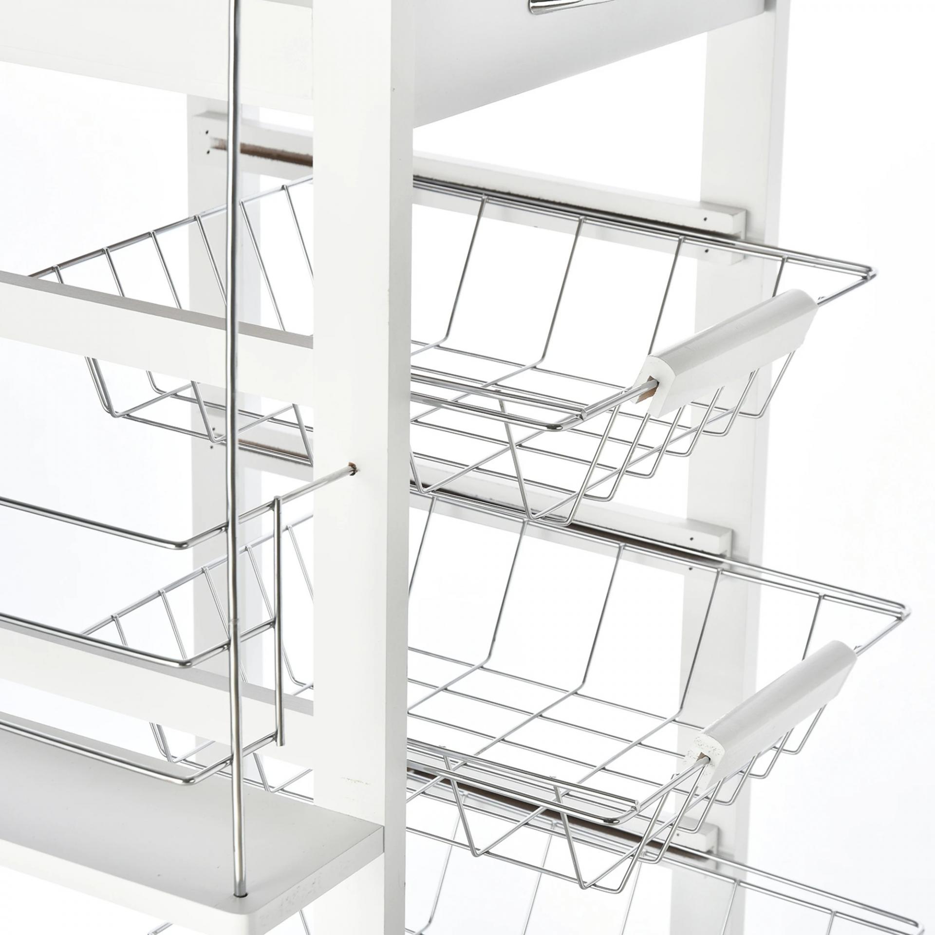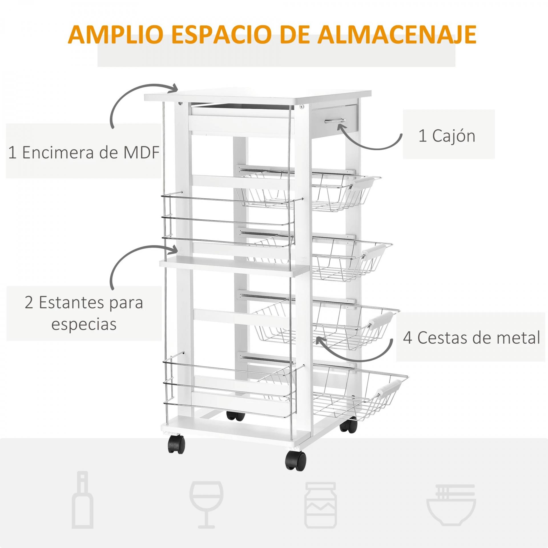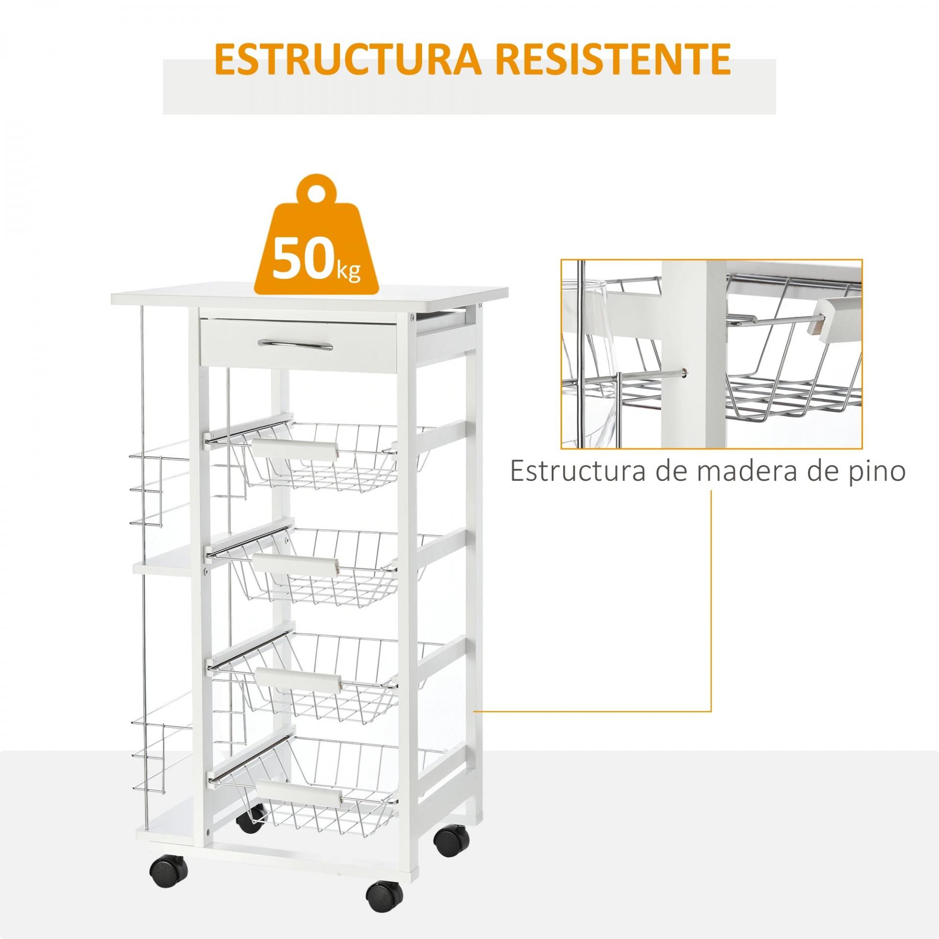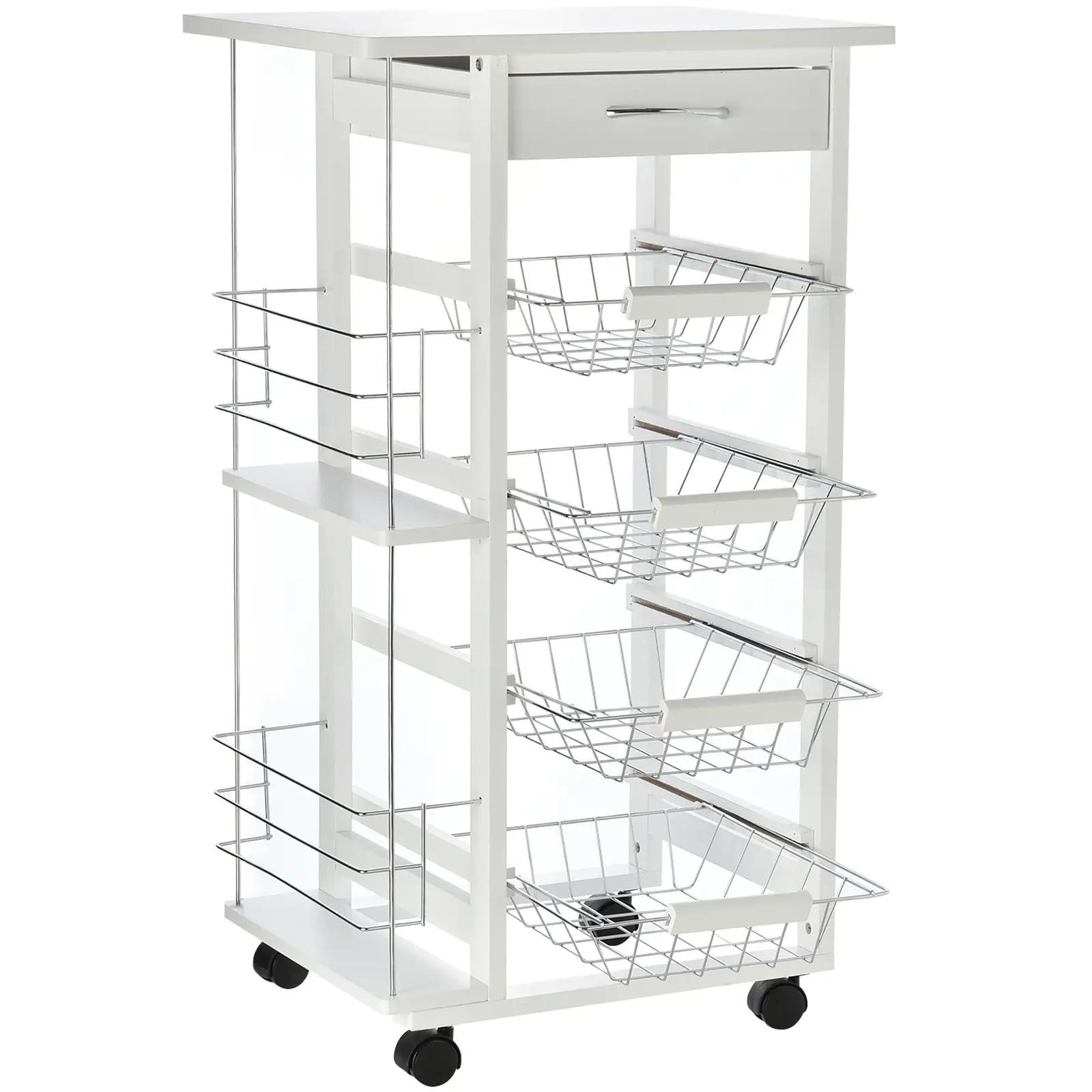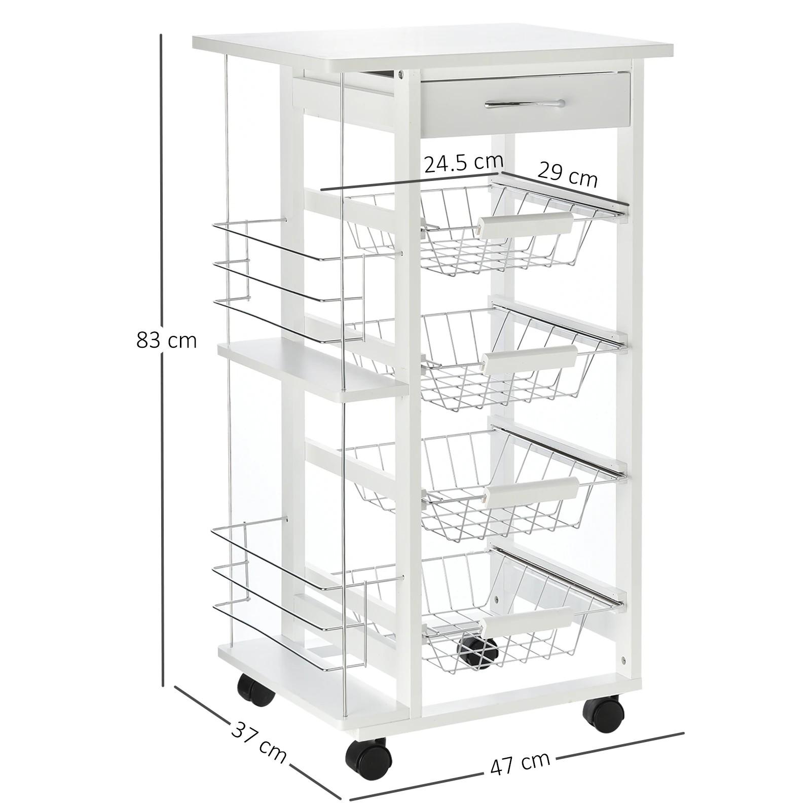 Carrito de Cocina con Ruedas Carro Multiusos con Cajón 4 Cestas Extraíbles de Metal y Bastidores 47x37x83 cm Blanco