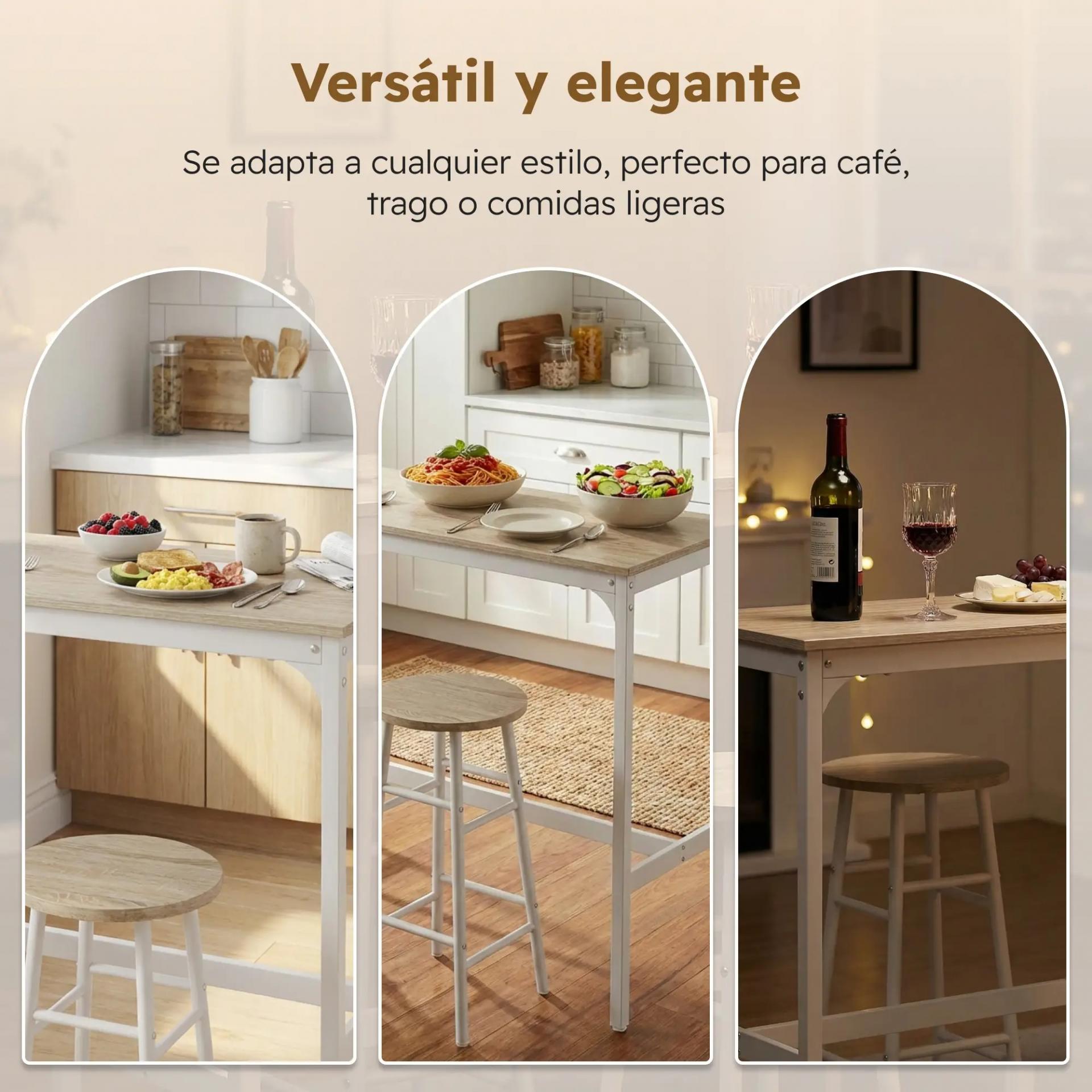 - DISEÑO: Este conjunto de mesa alta y taburetes de bar se integrará fácilmente en cualquier estilo de interior: vintage, industrial, contemporáneo… Con sus líneas sencillas y modernas, este juego de mesa y taburetes de bar tiene todo para encantar. Nada como una estructura y unas patas de acero blanco para realzar una bonita encimera de efecto madera clara