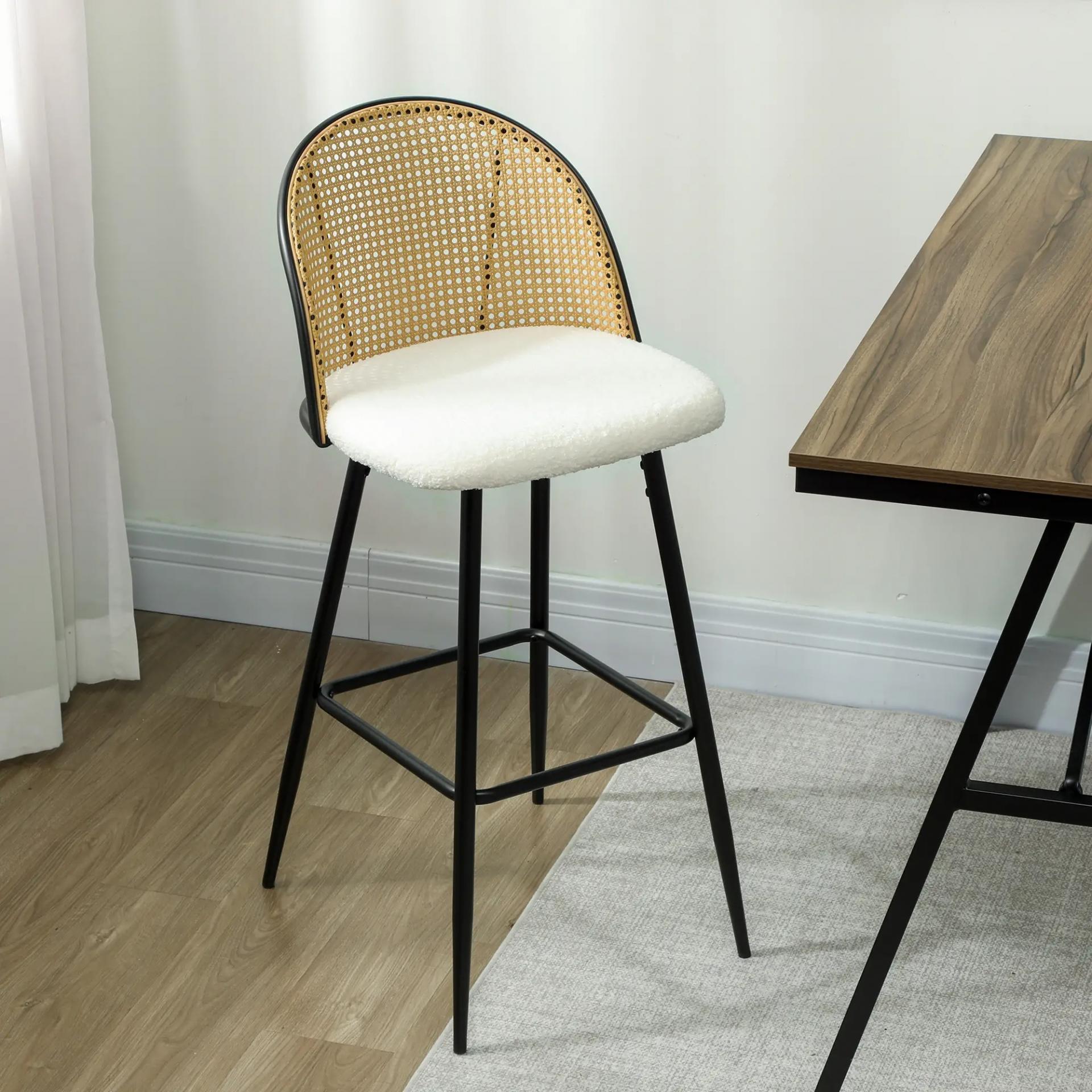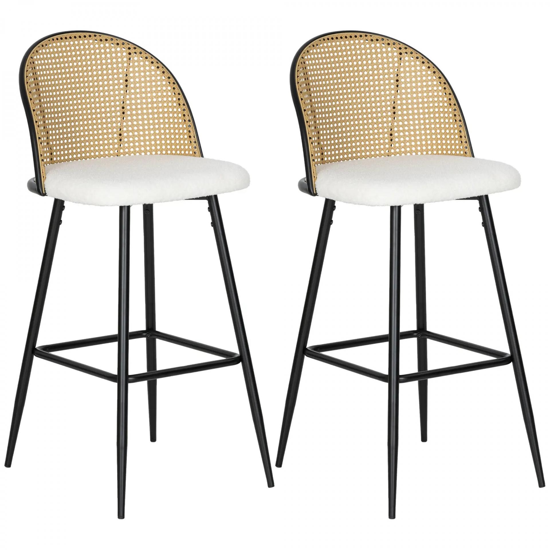 Juego de 2 Taburetes de Bar con Respaldo de Ratán Asiento Tapizado en Borreguito Marco de Acero y Reposapiés Crema