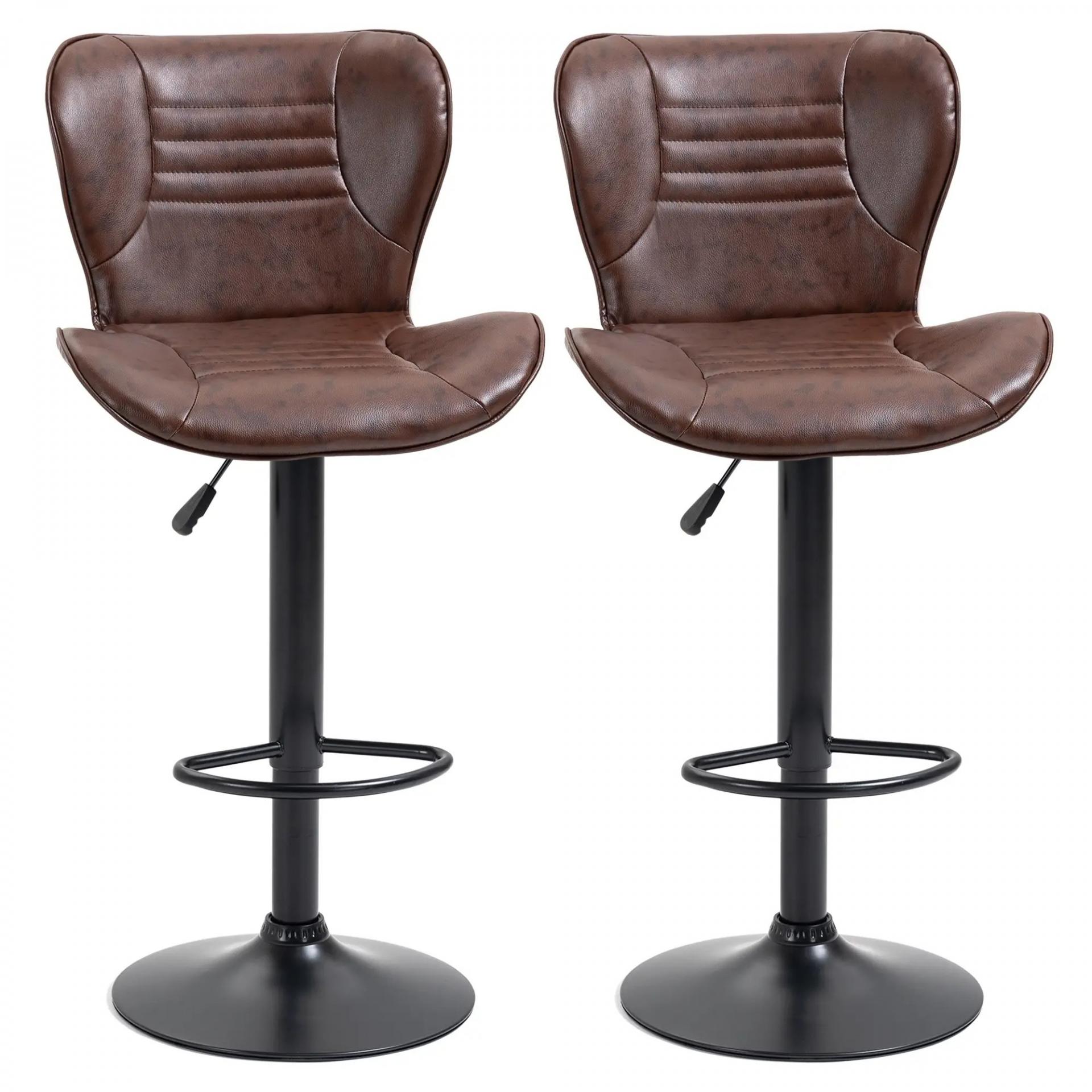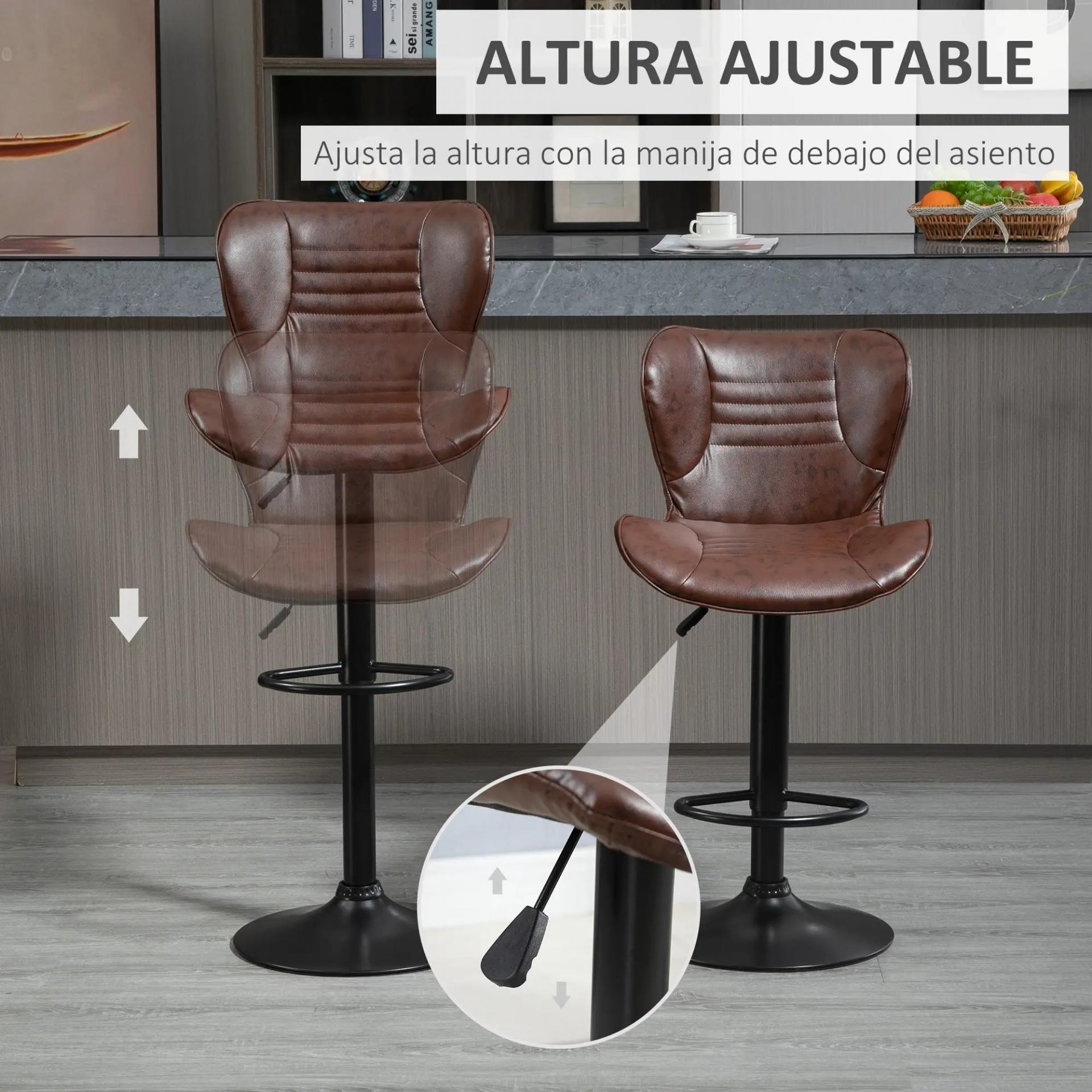 Juego de 2 Taburetes de Bar Tapizado en Cuero Sintético Taburetes Altos de Comedor Regulable en Altura Giratorio con Respaldo y Reposapiés 46,5x54x88-108 cm Marrón