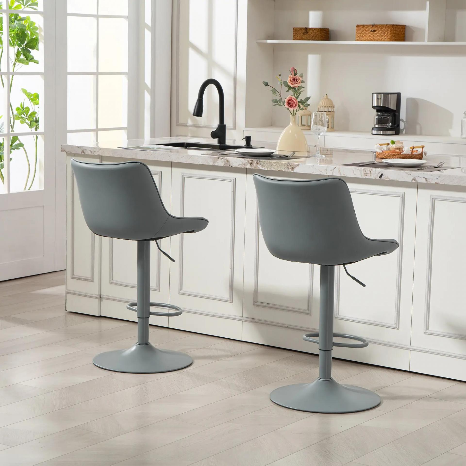 Juego de 2 Taburetes de Bar con Altura Ajustable Respaldo Asiento de Piel Sintética Marco de Acero y Reposapiés Gris