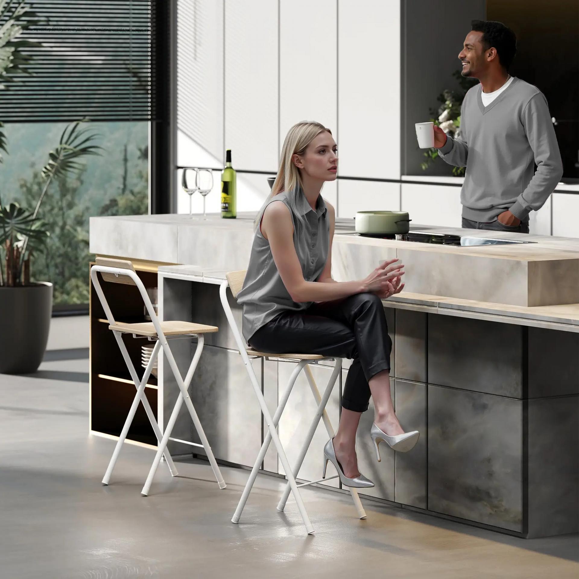 - PLEGABLES Y AHORRAN ESPACIO: Estos taburetes de bar totalmente plegables son ideales para guardarlos fácilmente. Su diseño sin reposabrazos permite colocarlos bajo la mayoría de las barras, perfectos para espacios pequeños