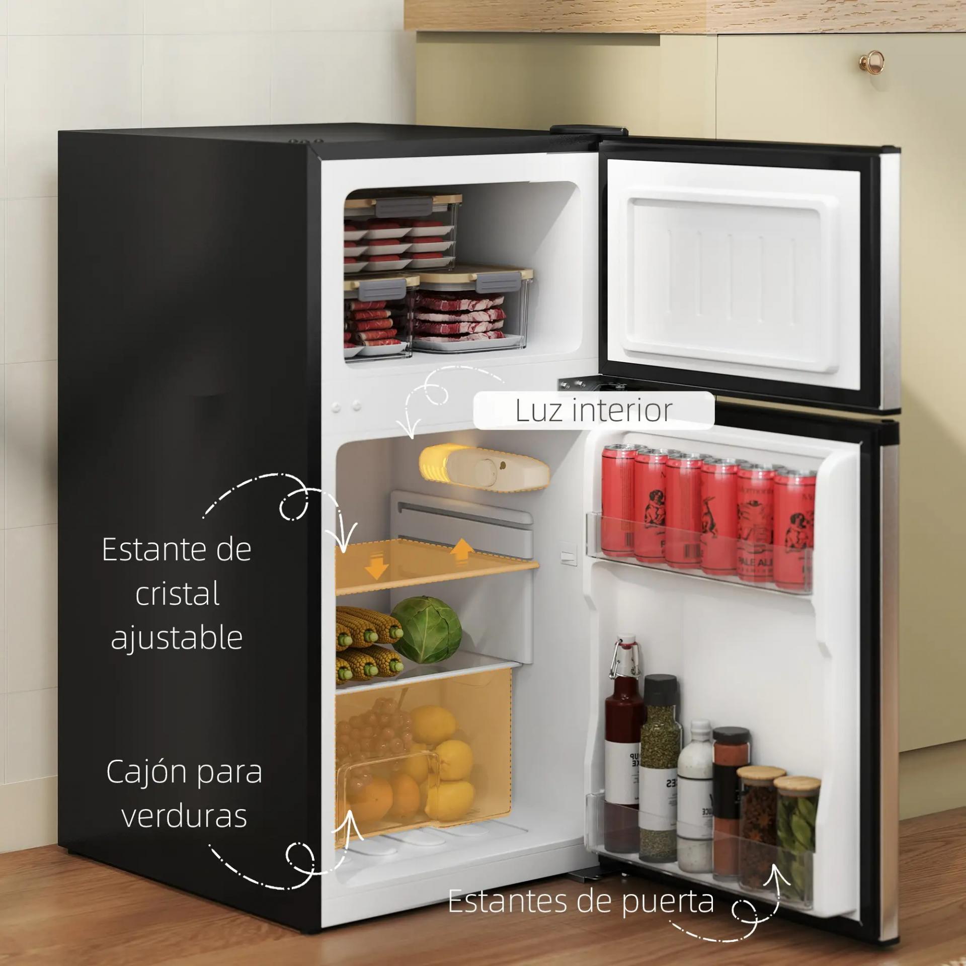 - - ALMACENAJE PERSONALIZABLE: La mini nevera incorpora estantes de cristal extraíbles, cajón para frutas y verduras y compartimentos en la puerta con espacio para botellas de hasta 2L, permitiendo organizar desde huevos hasta refrescos de manera práctica