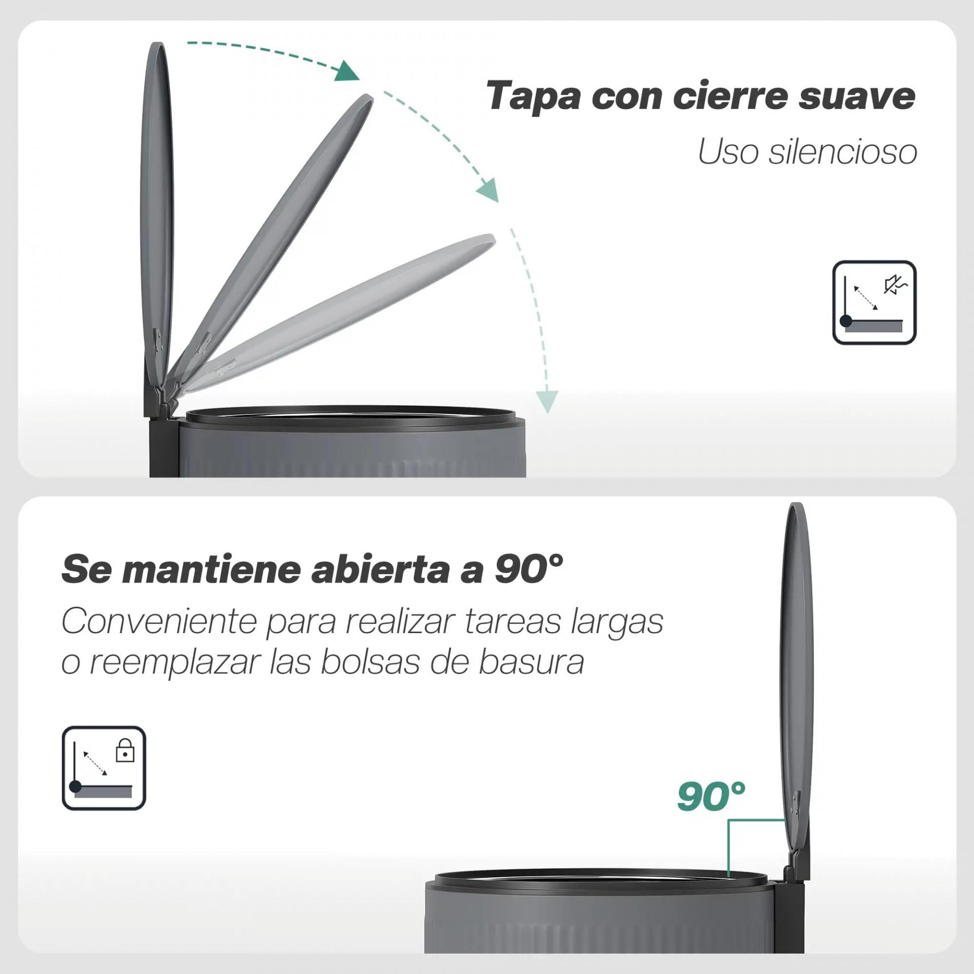 - - TAPA QUE SE MANTIENE ABIERTA: La tapa de este cubo de basura se mantiene fija a 90°, lo que facilita vaciar la basura y cambiar la bolsa, permitiendo usar ambas manos y haciendo estas tareas más cómodas y rápidas