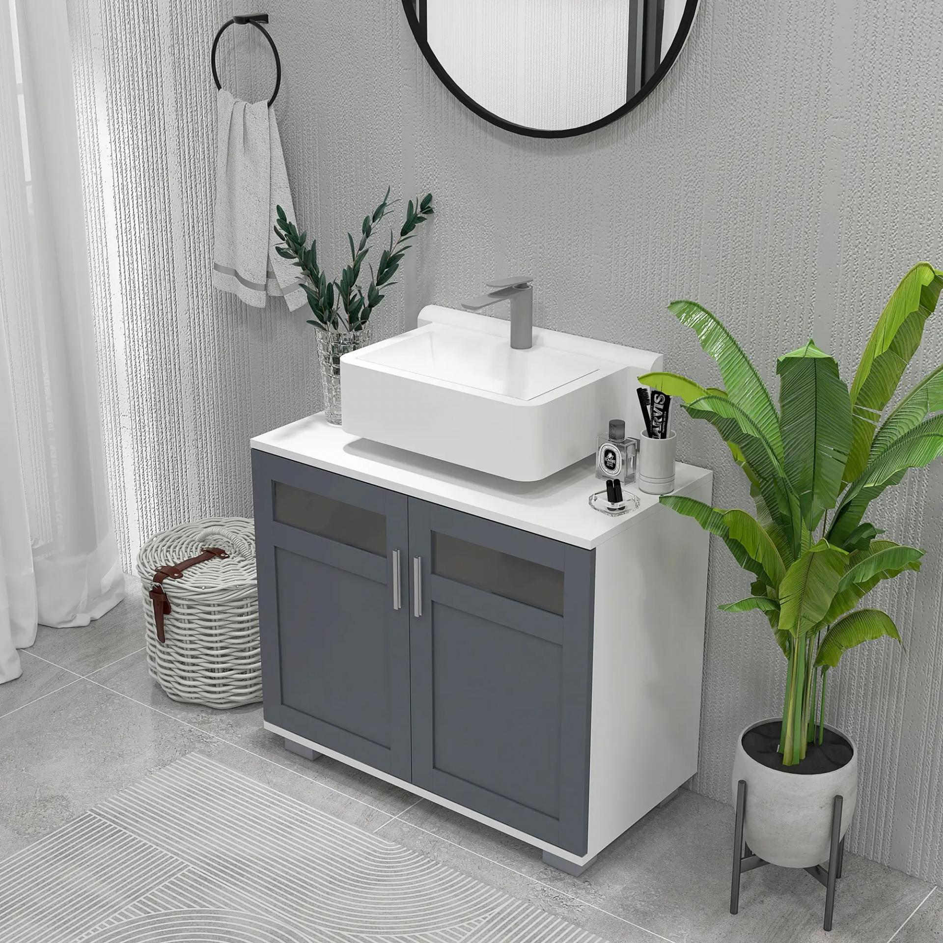 - RESISTENTE Y ELEGANTE: Fabricado con estructura de MDF, este mueble bajo lavabo con pie es resistente y puede soportar hasta 30 kg en total. Además, gracias a la bonita combinación de colores blanco y gris con la puerta con detalles en cristal templado, este mueble auxiliar aportará un toque de elegancia allá donde lo coloques