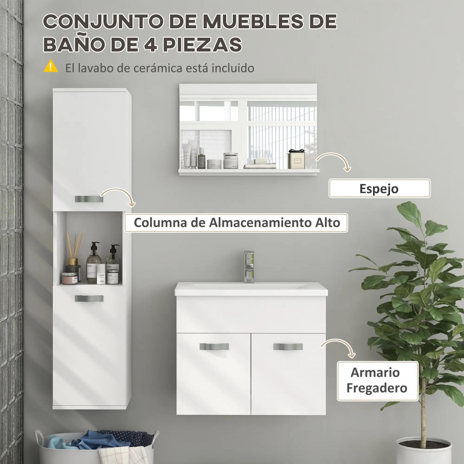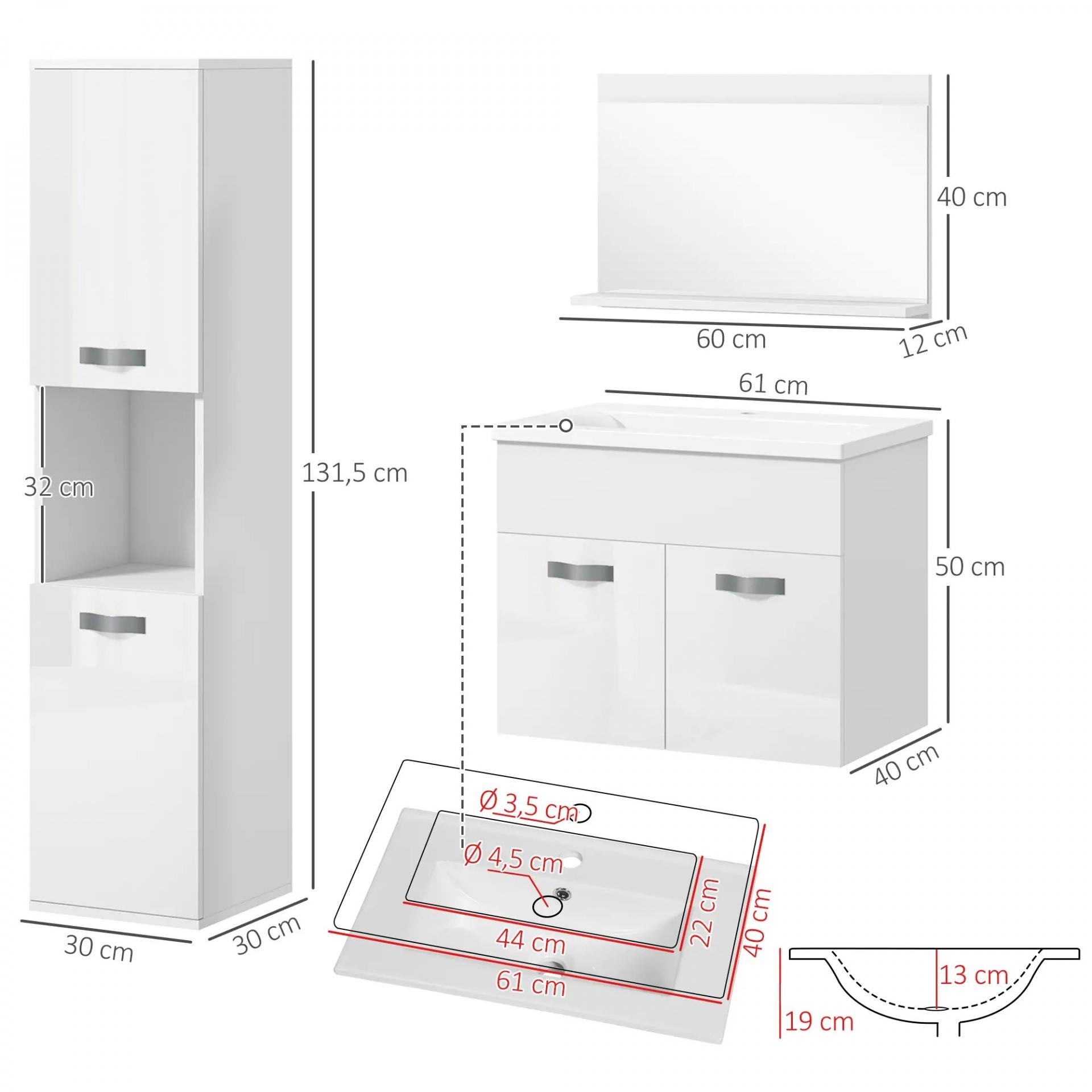 - - ESPECIFICACIONES DEL PRODUCTO: Lavabo de cerámica: 61x40x19 cm (LxANxAL). Armario con espejo: 60x12x40 cm (LxANxAL). Mueble de tocador: 61x40x50 cm (LxANxAL). Armario alto: 30x30x131,5 cm (LxANxAL). Requiere montaje