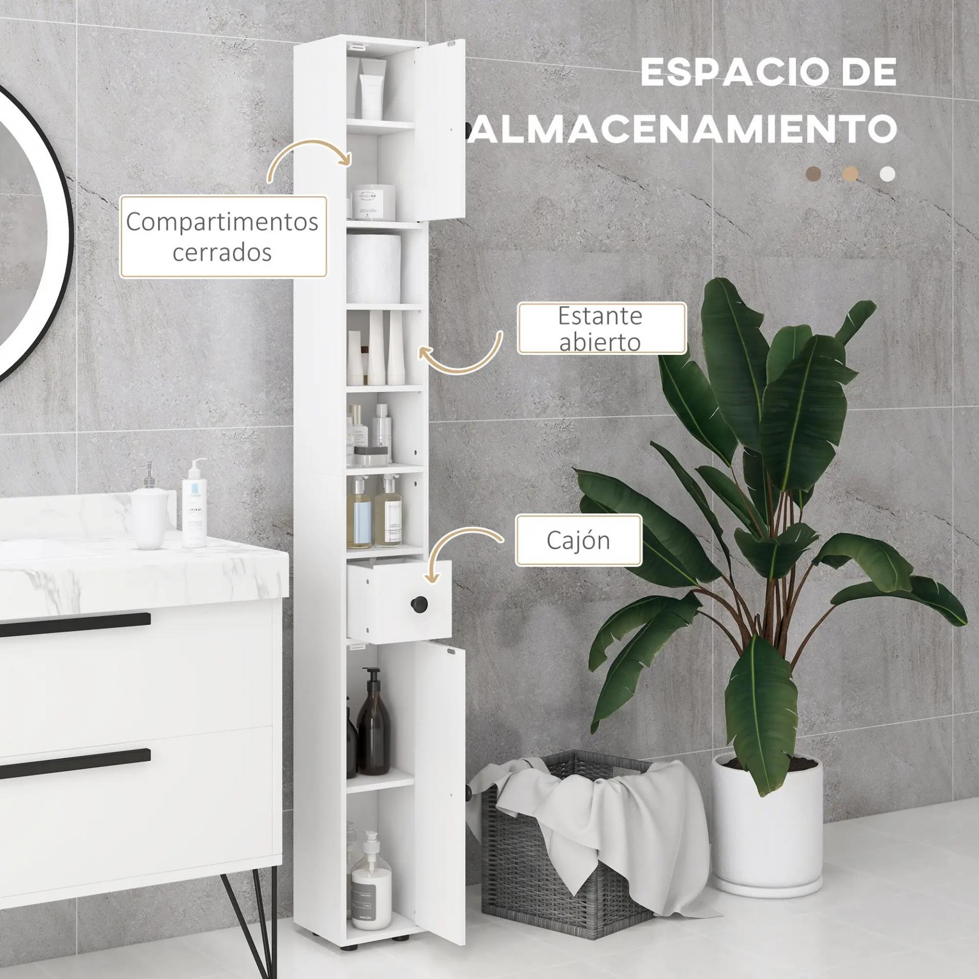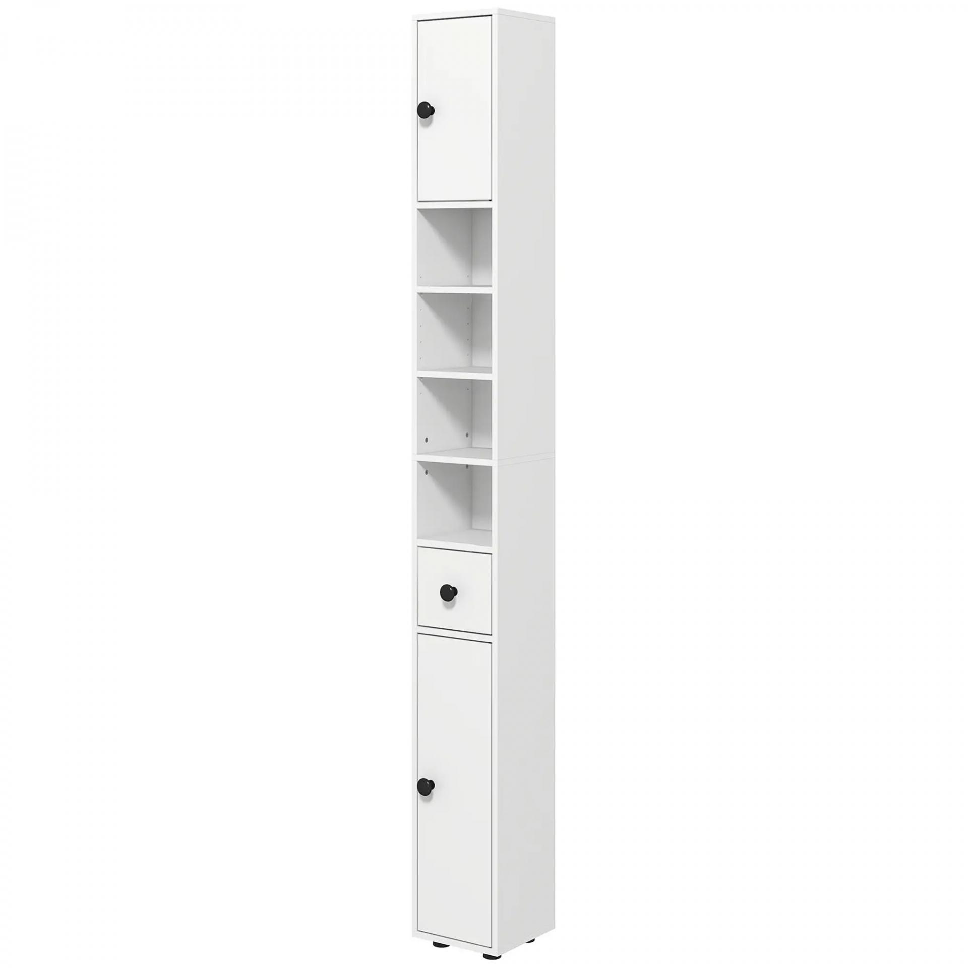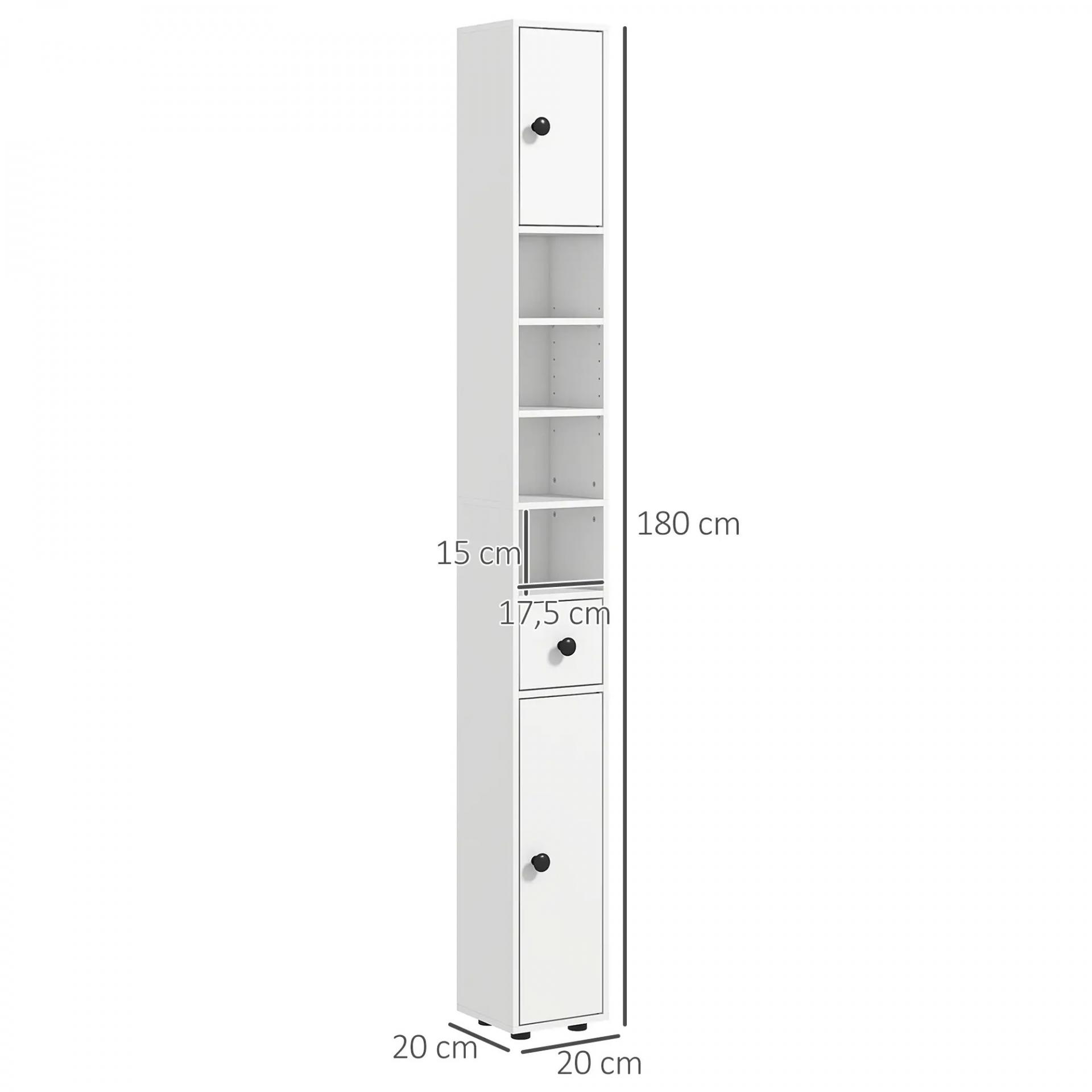 Mueble Auxiliar Baño Moderno con 1 Cajón 5 Estantes y 2 Armarios para Salón Dormitorio Carga 30 kg 20x20x180 cm Blanco
