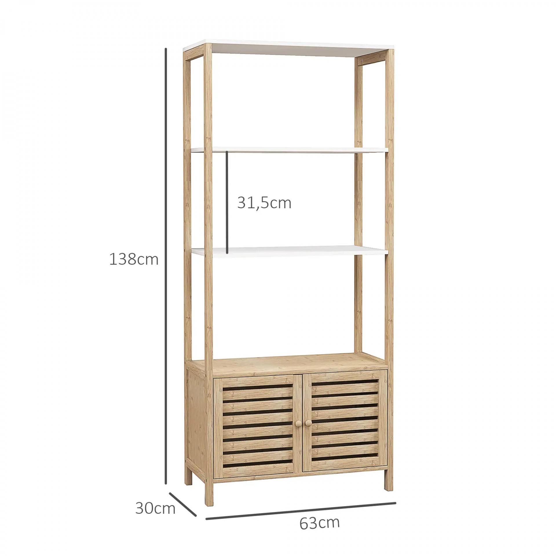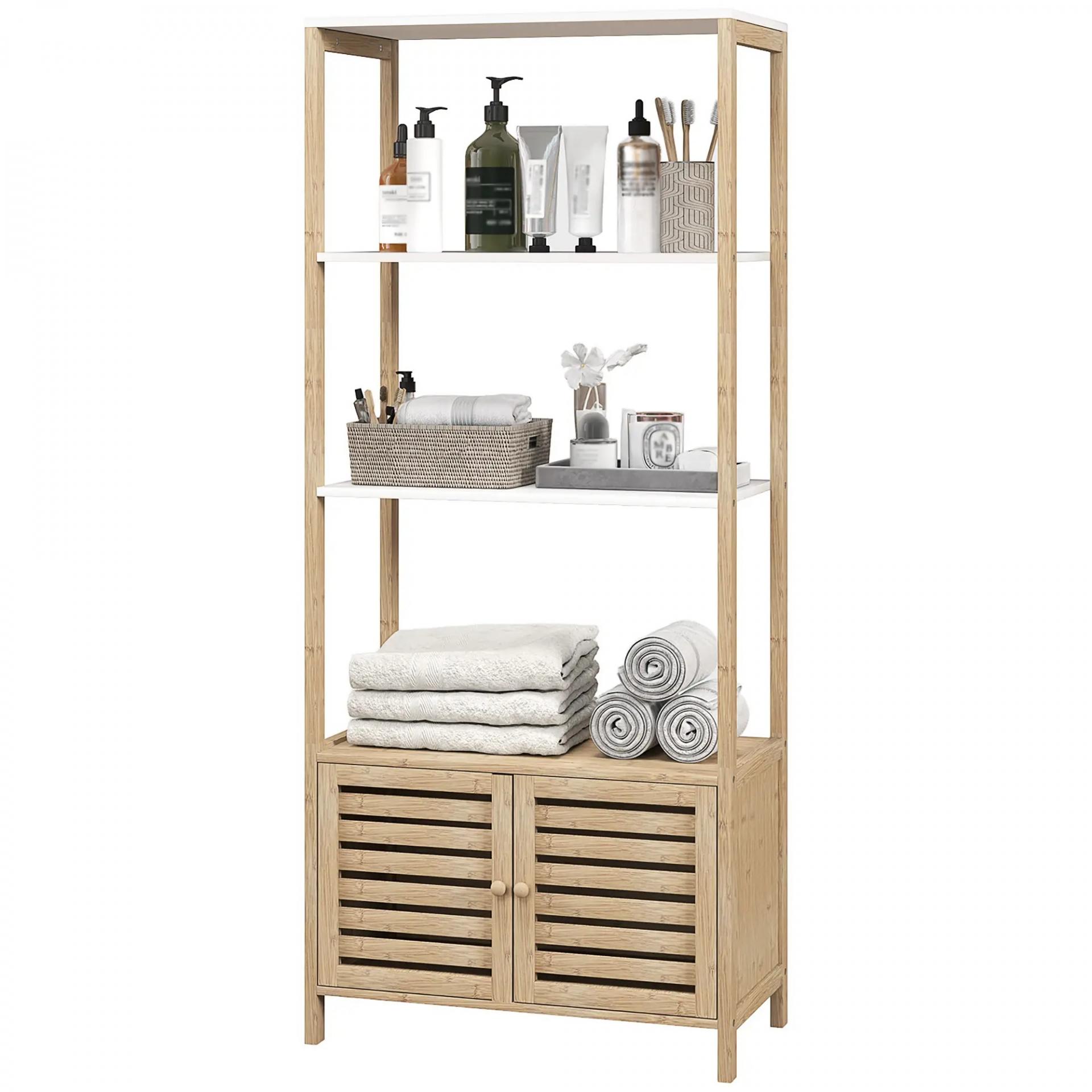 Estantería de Baño de Bambú con 3 Estantes Abiertos Puertas de Lamas 63x30x138 cm Natural y Blanco