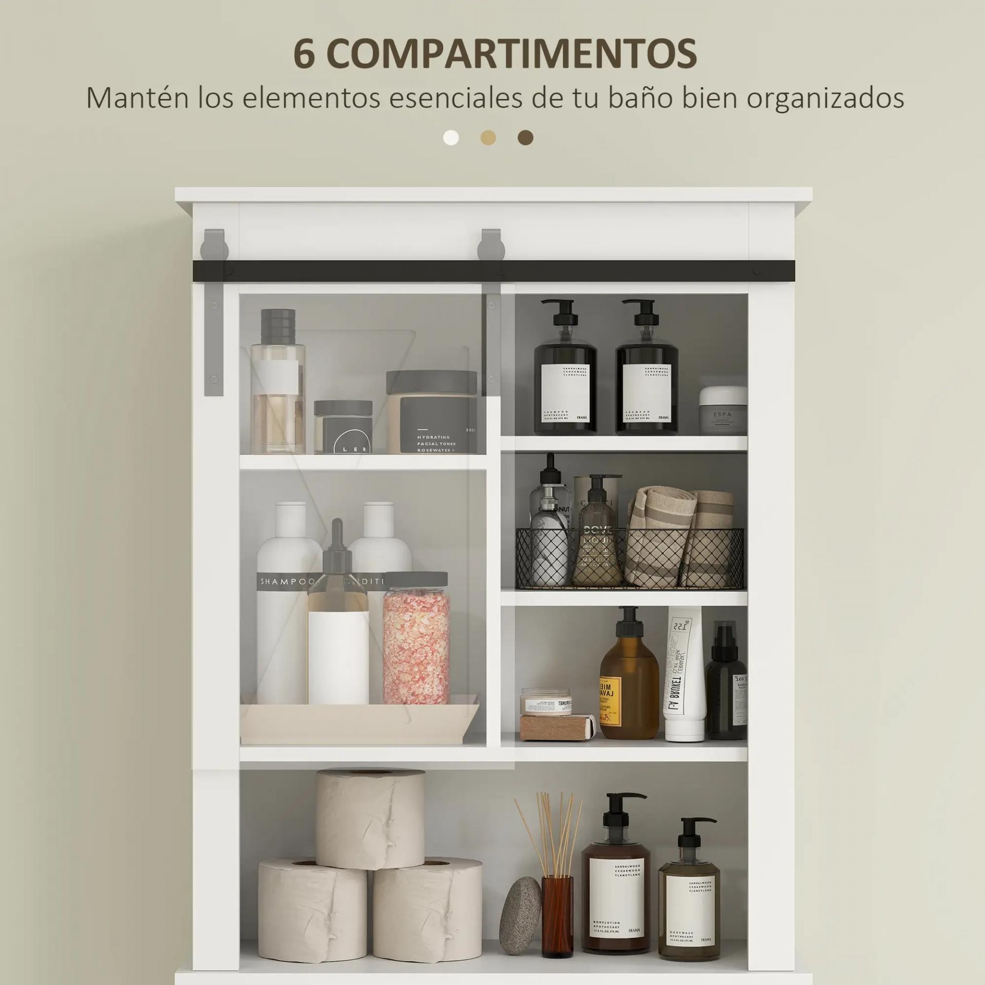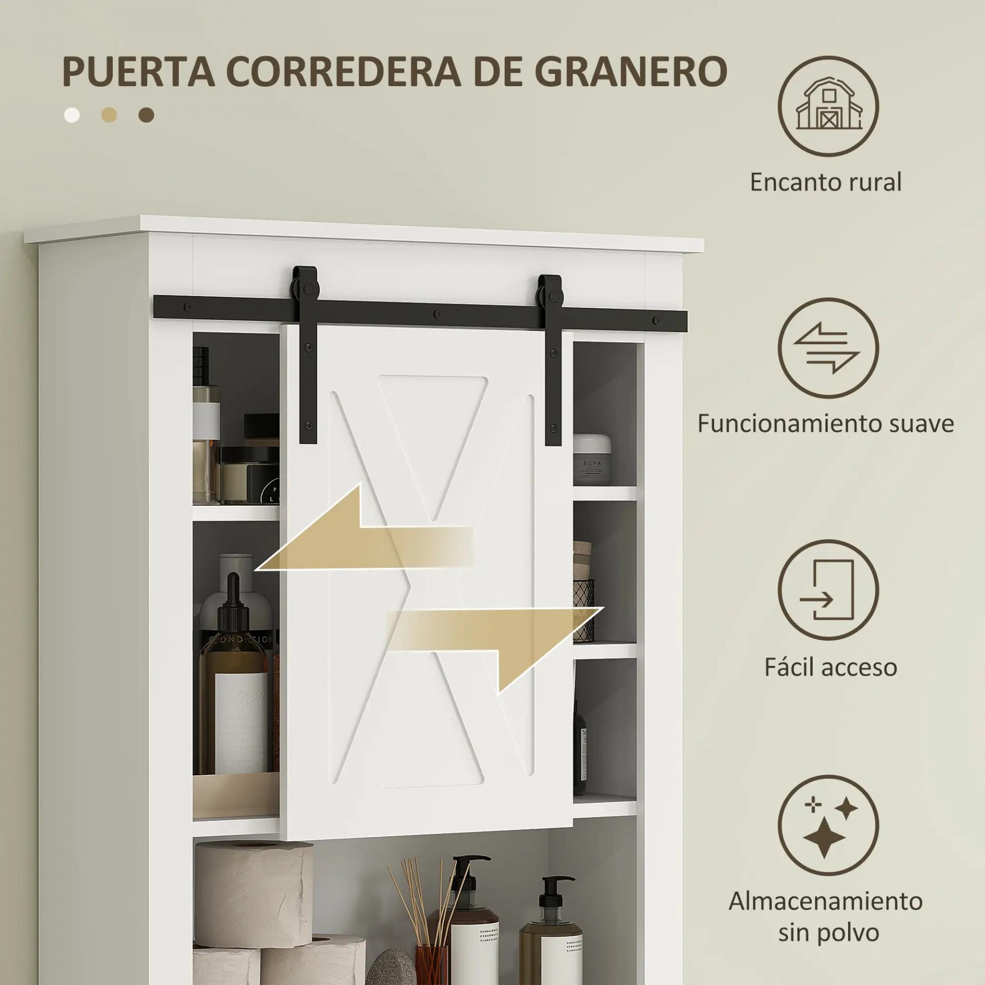 - PUERTA DE GRANERO CORREDERA: Este mueble sobre inodoro cuenta con una puerta deslizante que ofrece almacenamiento abierto y cerrado, facilitando el acceso y ocultación de objetos. Su diseño con detalles metálicos le dará un toque rústico a tu baño