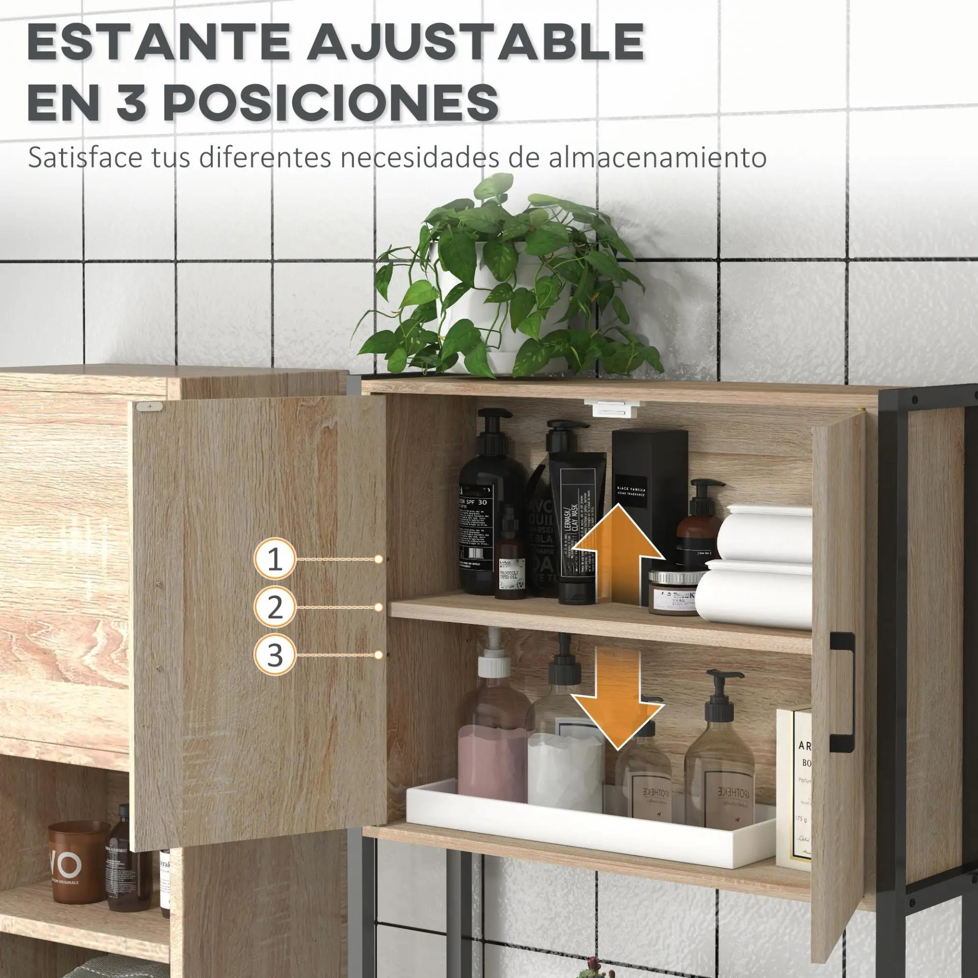 - - BALDA AJUSTABLE: El armario superior de este mueble de WC incluye una balda ajustable en 3 posiciones, con 5 cm entre niveles. Puedes adaptarla fácilmente según la altura de tus productos para mantener todo organizado a tu manera