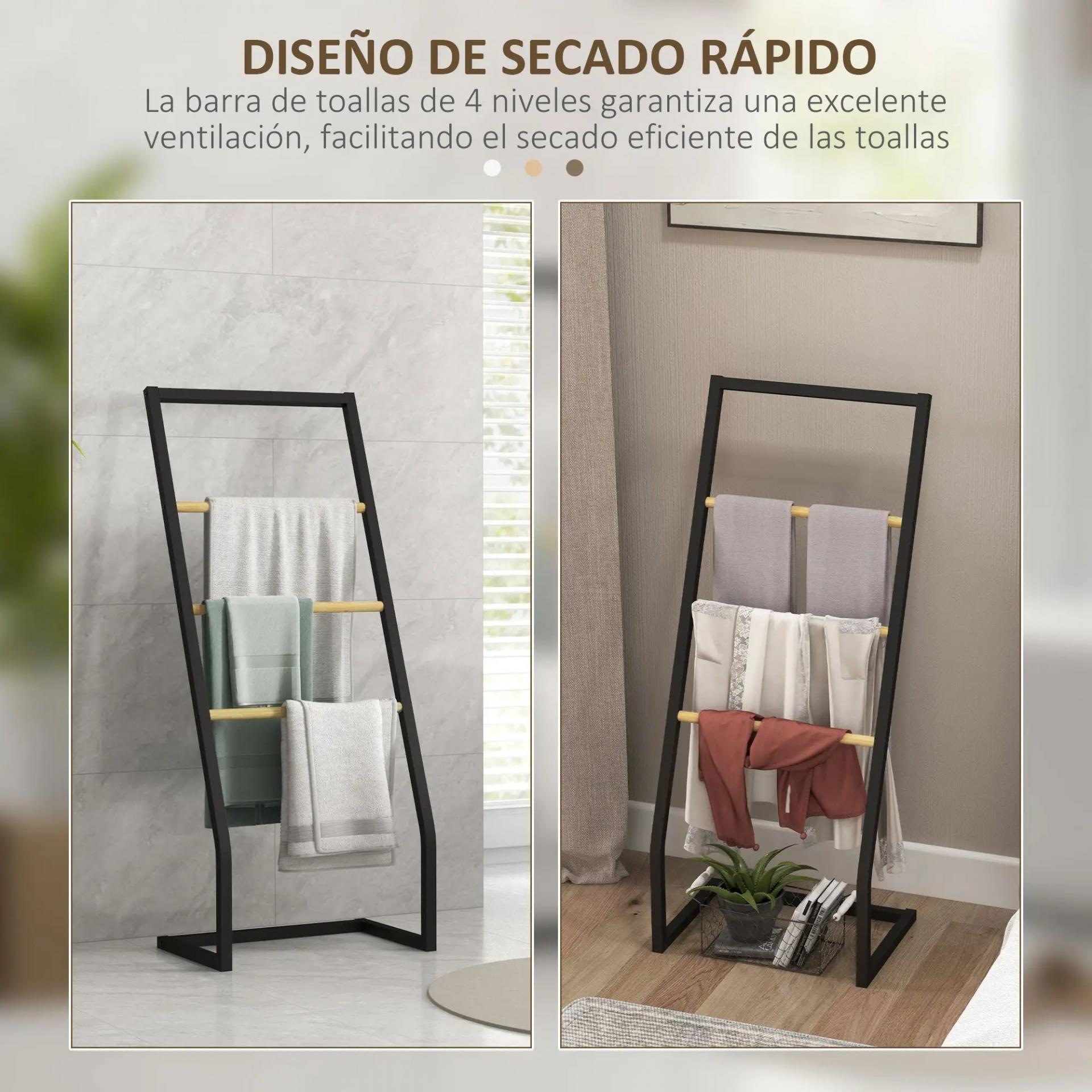 - - DISEÑO DE 4 NIVELES: El toallero de pie cuenta con 4 barras de diferentes alturas, proporcionando espacios amplios y definidos para colgar tus toallas de forma ordenada. Este diseño permite un secado rápido y evita que las toallas se arruguen