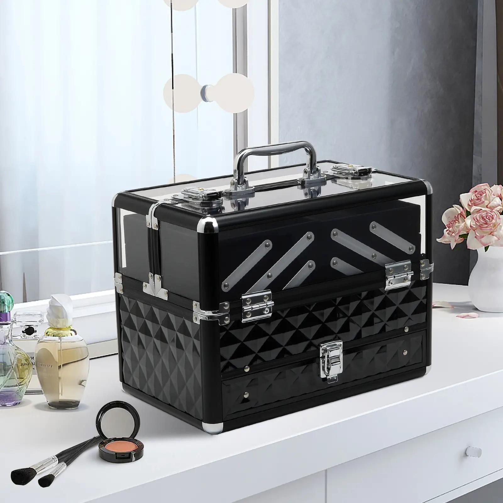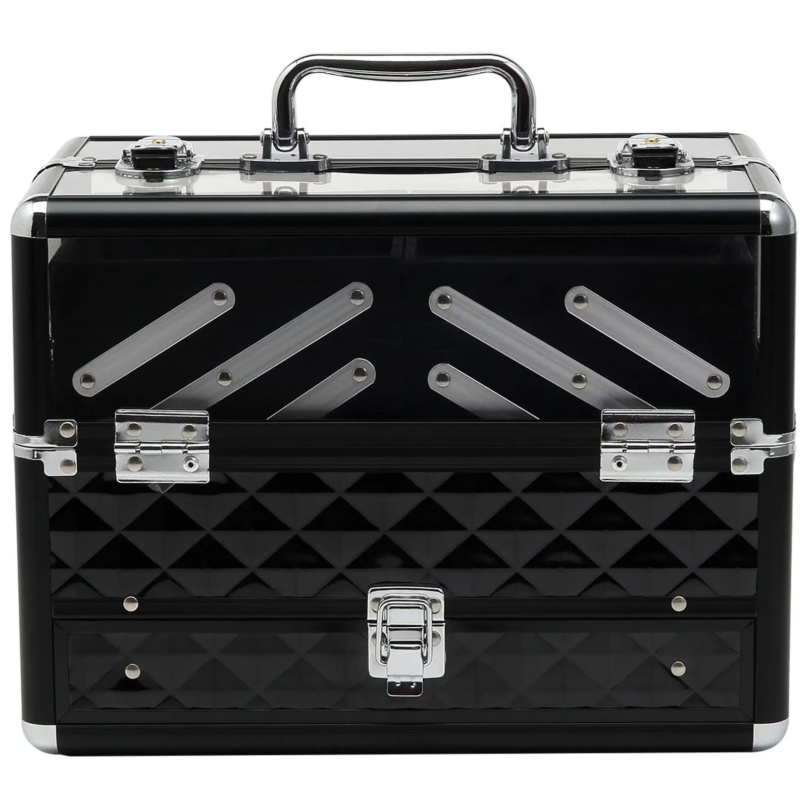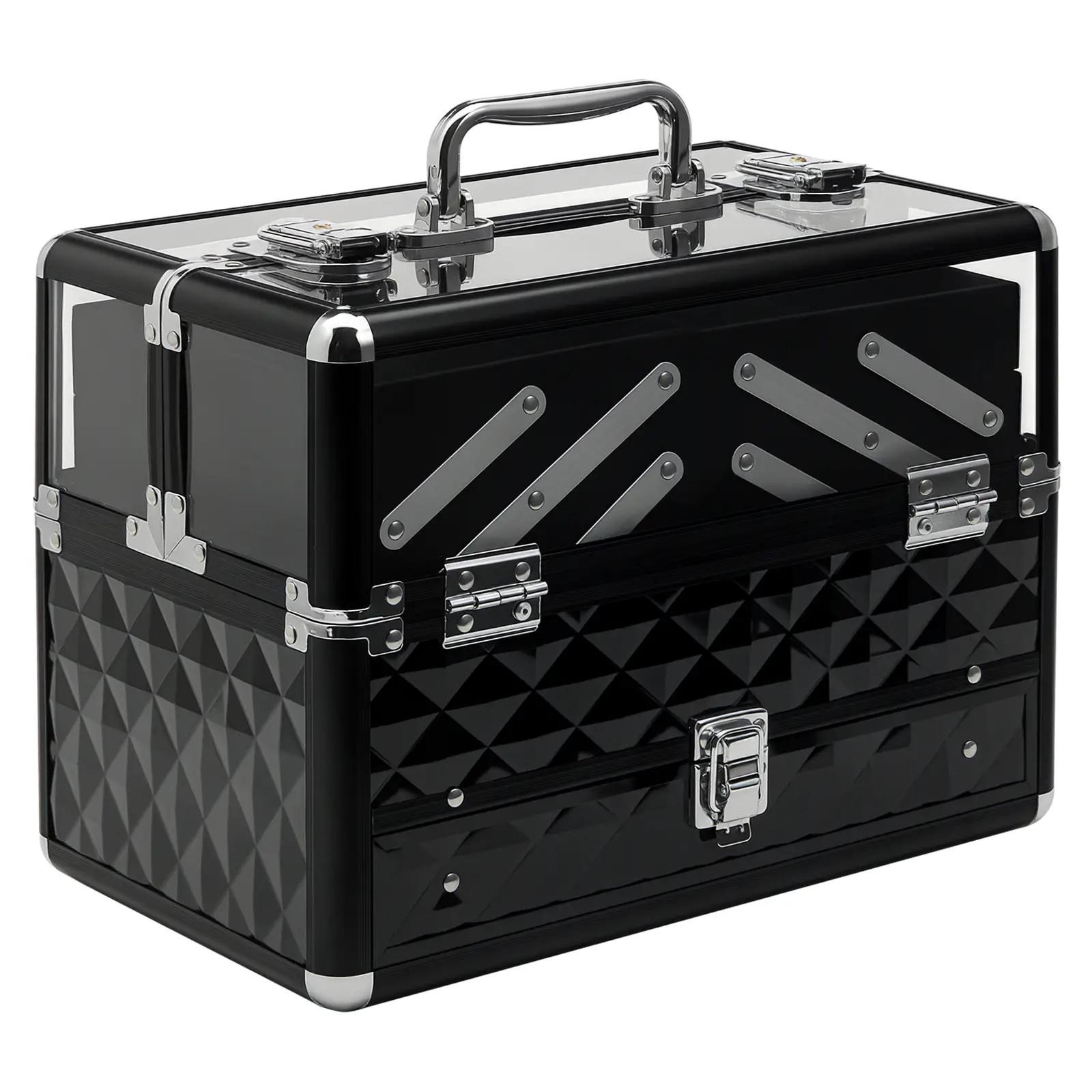 Maletín de Maquillaje Bisutería Organizador Cosméticos Portátil Múltiples Niveles Con Asa y Bandejas Desplegables Aleación de Aluminio 30x18,5x22 cm Transparente y Negro