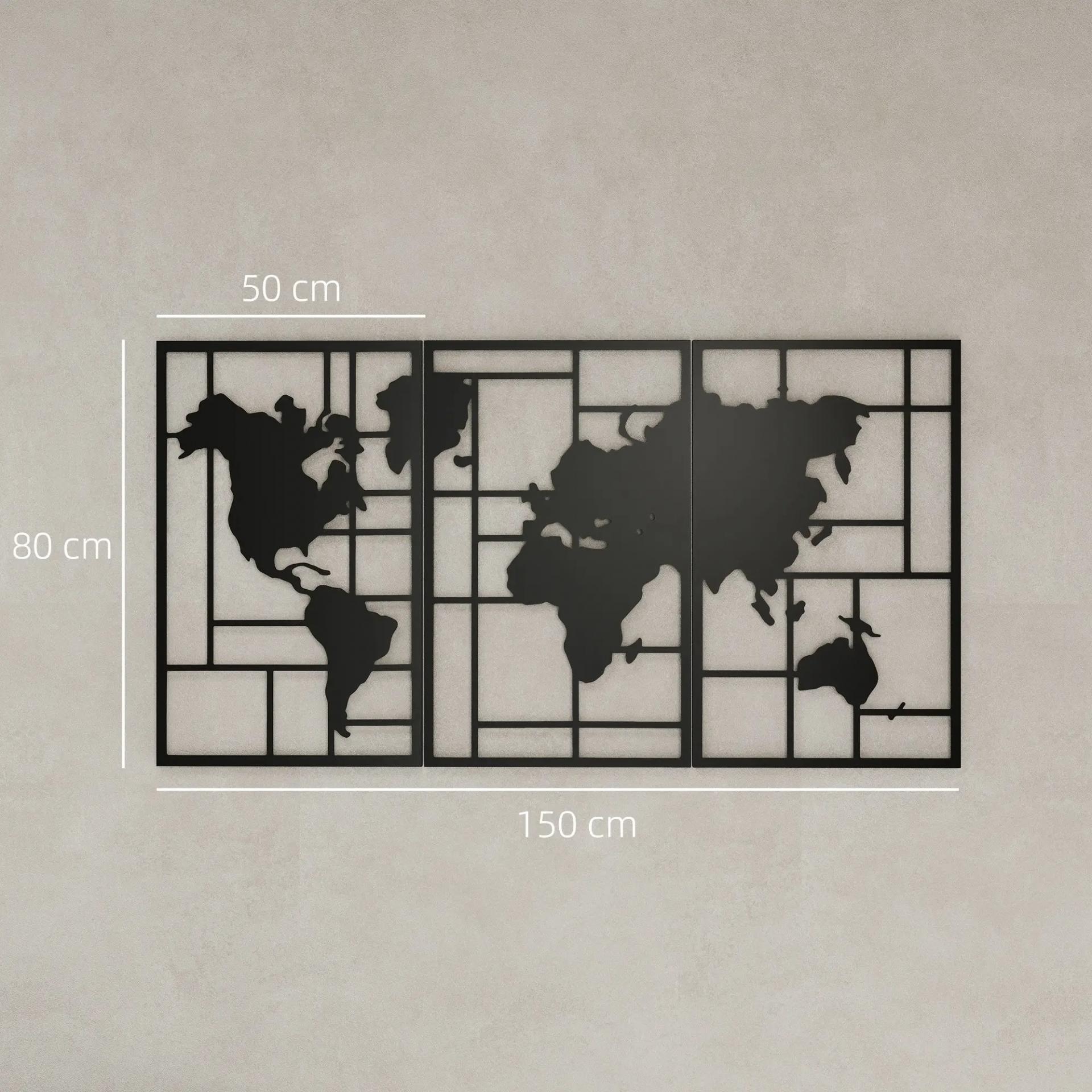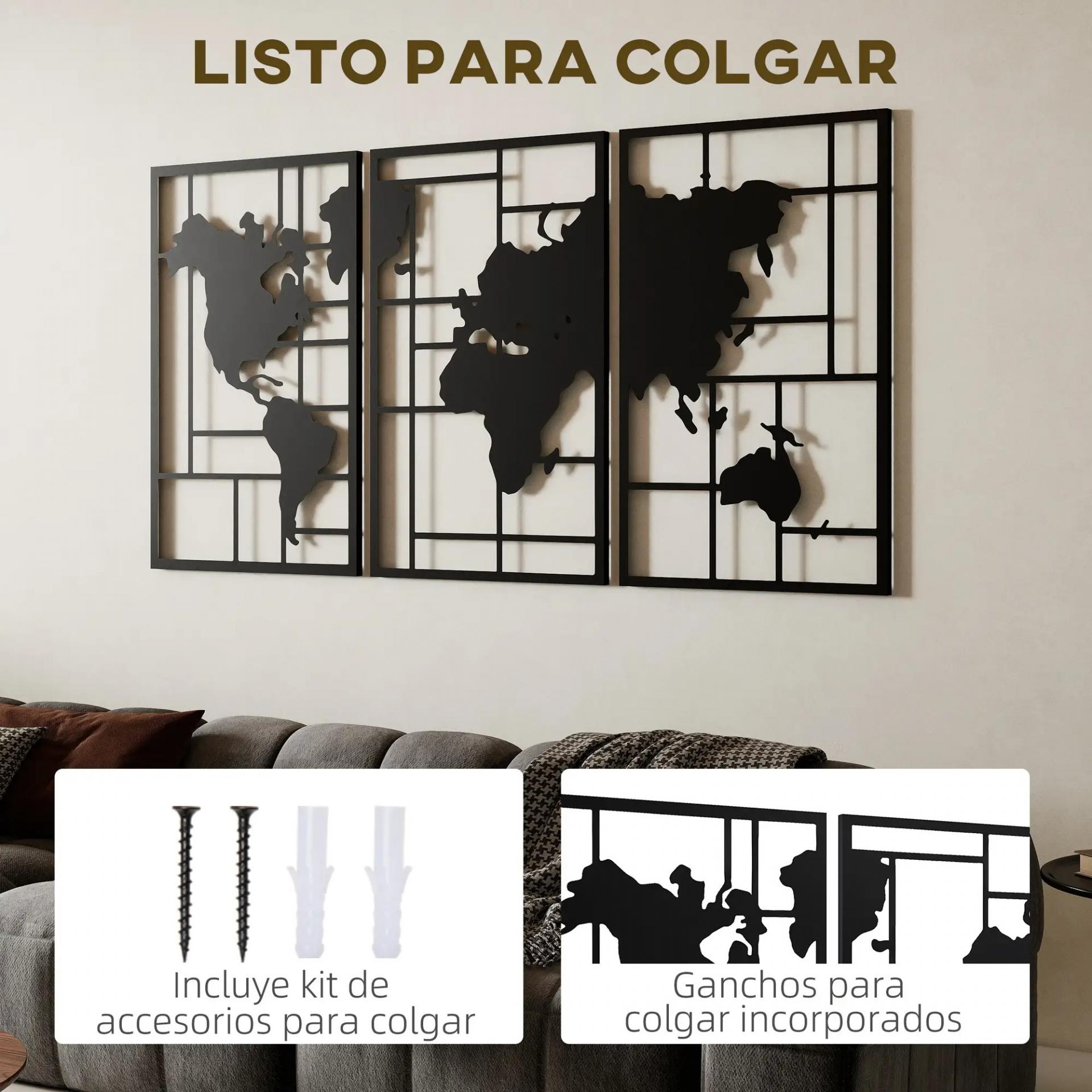 Decoración de Metal para Pared de Mapa Mundial de 3 Piezas para Salón Dormitorio Pasillo Negro
